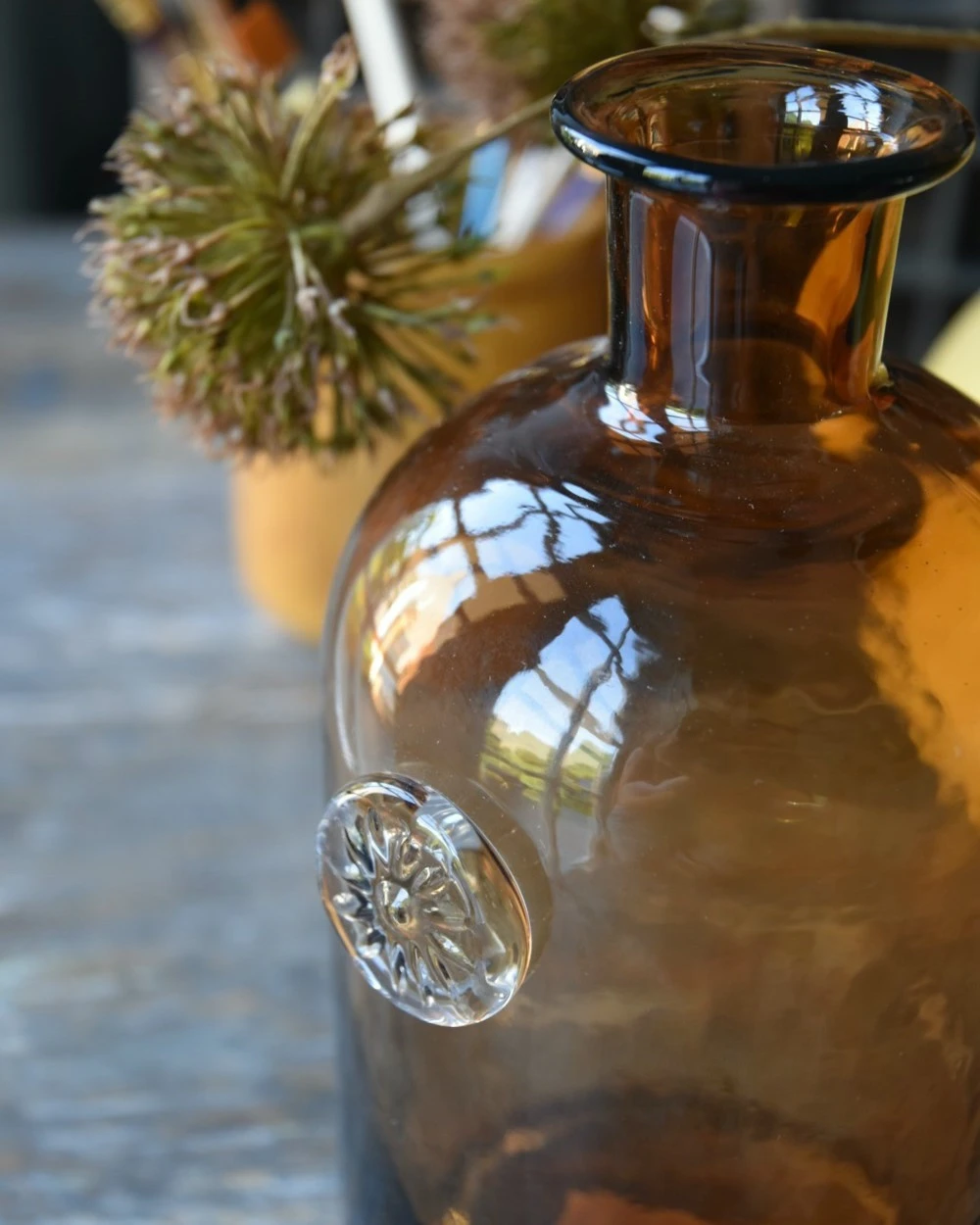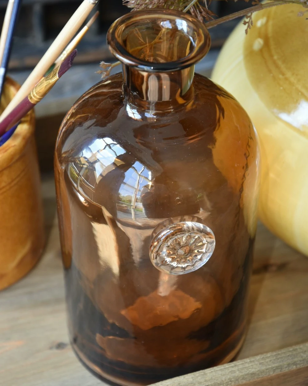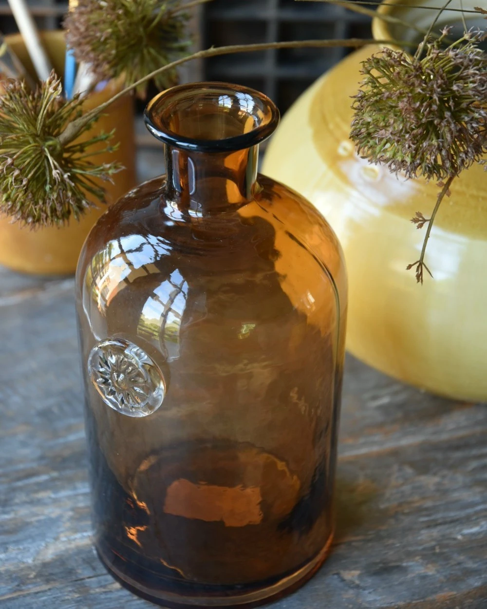 Apothekers fles van bruin glas met sierlijk embleem, IB Laursen. Deze glazen apothekers fles in mond geblazen, heeft bruin glas en een smalle hals. Op de fles zit een mooi doorzichtig glazen embleem. De fles kan als decoratie worden gebruikt in de vitrine kast, of op een plateau met andere potten boeken en planten. De oker potten uit de Unique serie van IB Laursen passen er bv heel goed bij.Â
