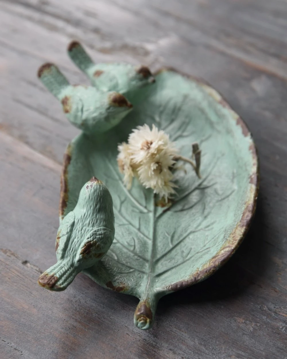 Blad Met 3 Vogeltjes Als Schaaltje In Antiek Turkoois