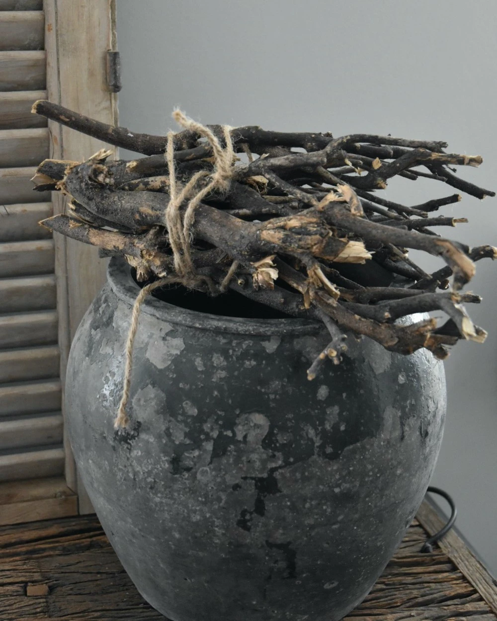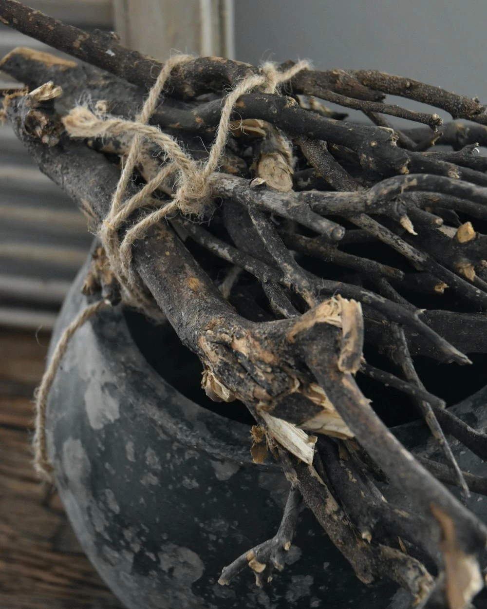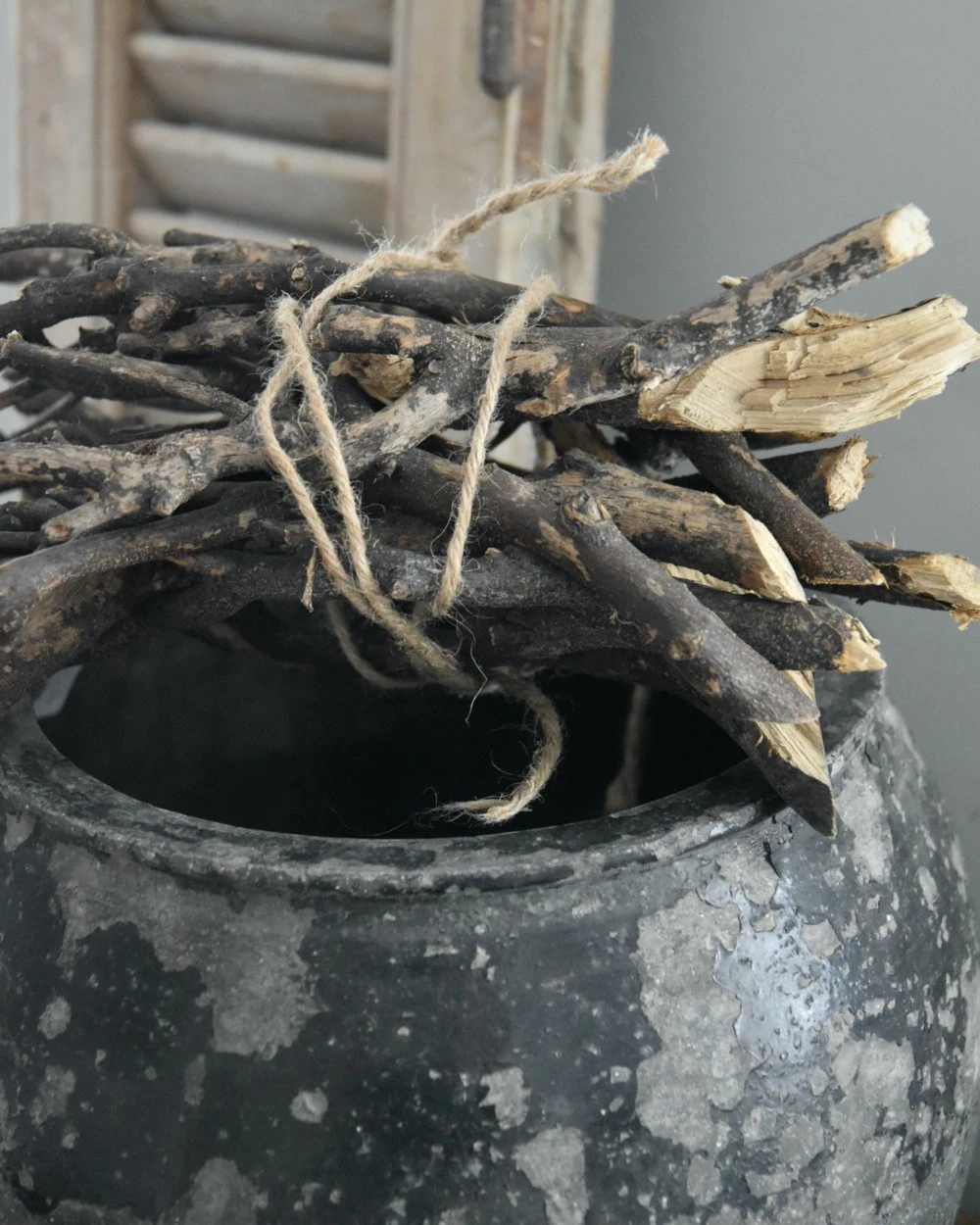 Bundel takken naturel. Deze bos takken met touw is decoratief op allerlei manieren. Zo kunt u ze op een mooie pot plaatsen, op een plateau of los in een vaas zetten met bv een seizoens gebonden sfeer. Zo kunt er in het voorjaar met eitjes en veertjes tussen verwerken en zelf losse bolletjes en mos, en rond de kerstdagen juist met wat kerstgroen en sneeuw wat lichtjes en ballen……….