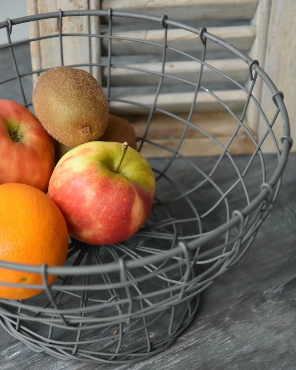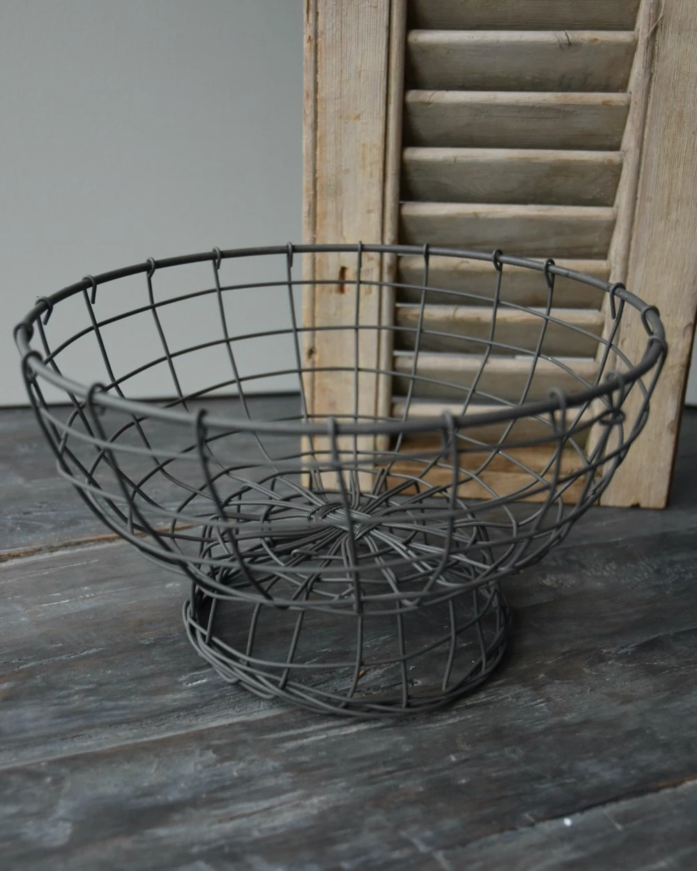 Draad mand ‘etagère’ op voet. Deze leuke grote draadmand etagere is van metaal draad gemaakt op een iets speelse/losse manier. Hierdoor is en geen mand hetzelfde en ontstaat er een gezellige mand op een voet waar het materiaal in doorloopt. U kunt de mand als bv fruitmand gebruiken of met een krans of toef erin.