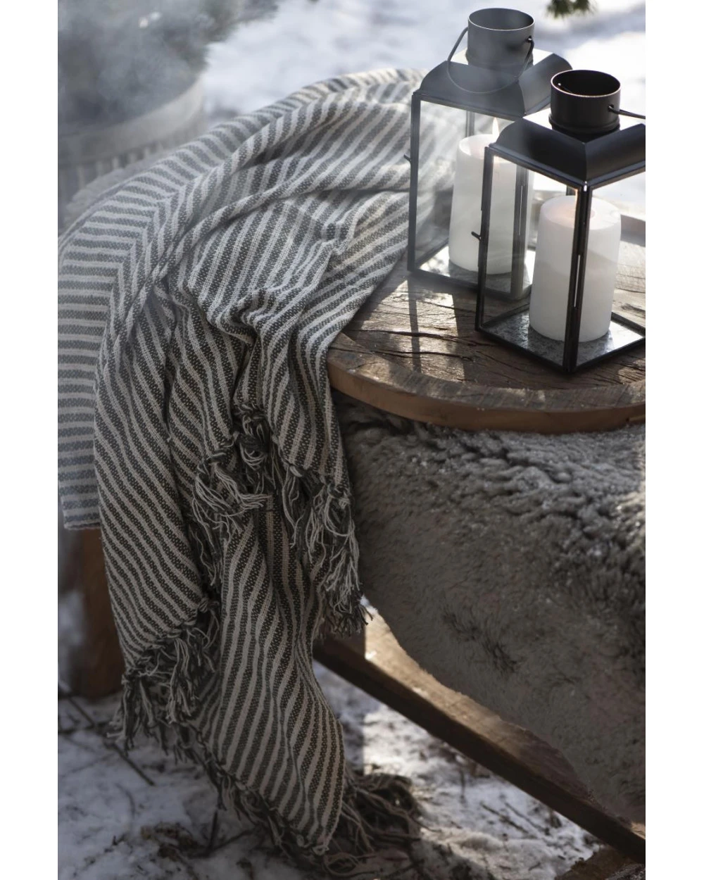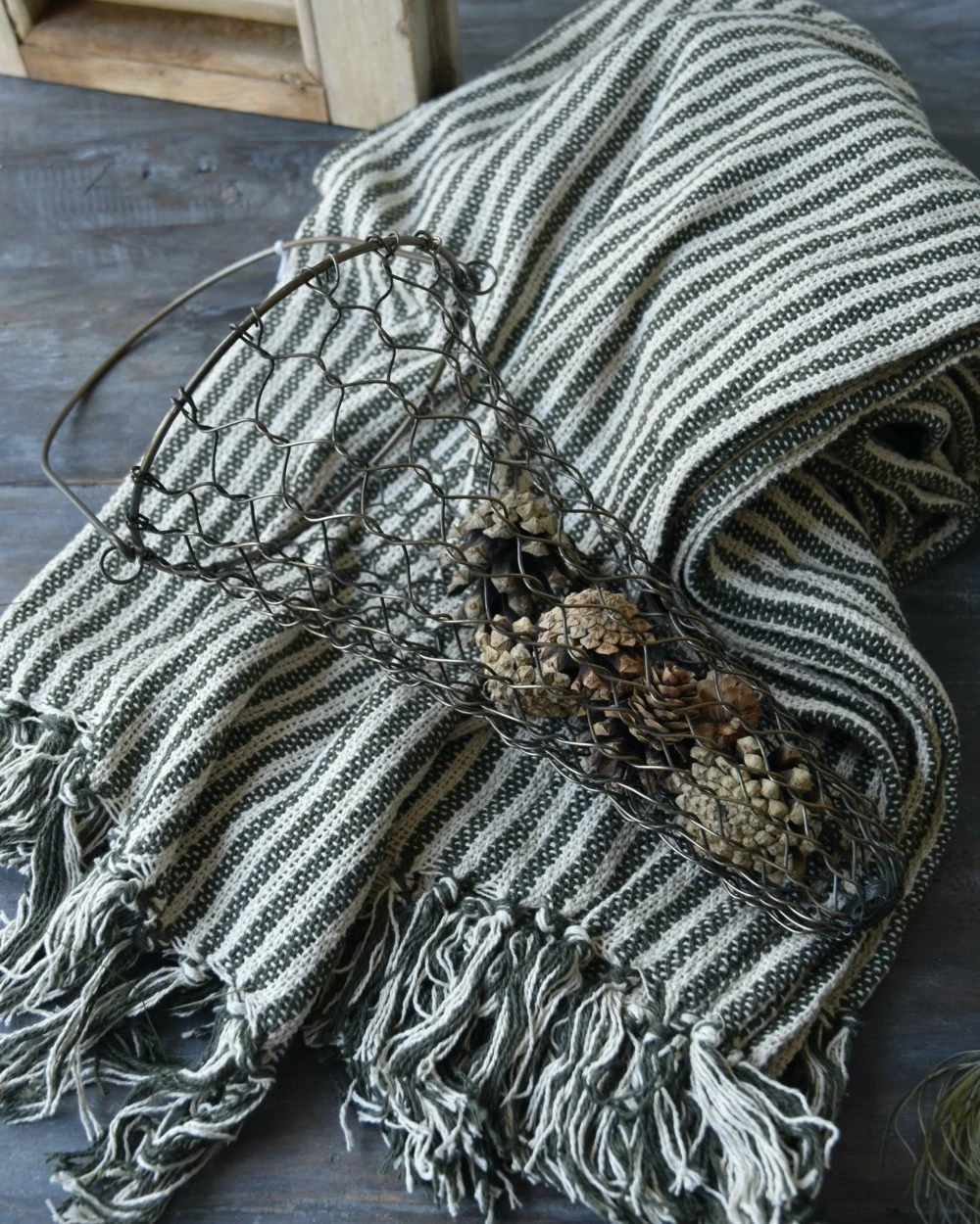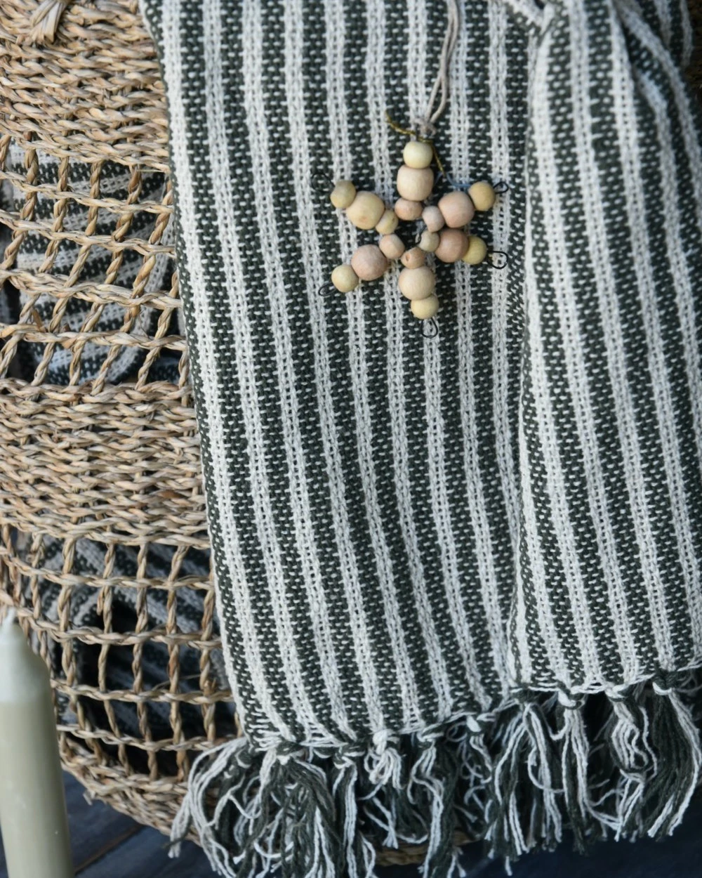 Geweven sprei olijfgroen gebroken wit gestreept met kwastjes, IB Laursen. Dit mooie woonkleed/sprei heeft een mooi geweven patroon van strepen in een mooi naturel gebroken wit met olijf groen. Zowel aan de onder als de bovenkant zitten er kwastjes aan het kleed. U kunt het kleed mooi decoreren /draperen over een stoel of bank, in een grote mand in de woonkamer of over het uiteinde van het bed…..Â