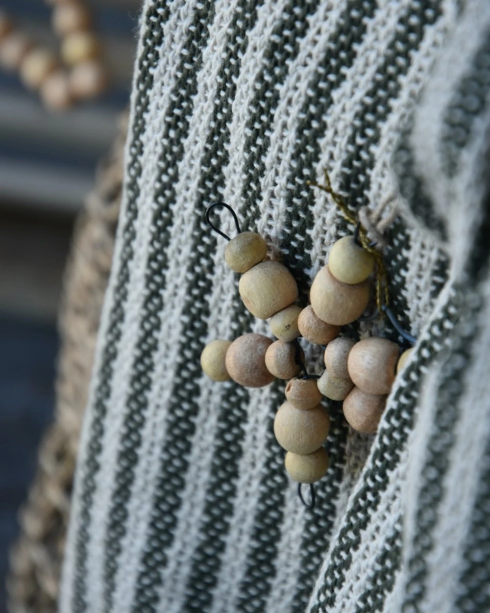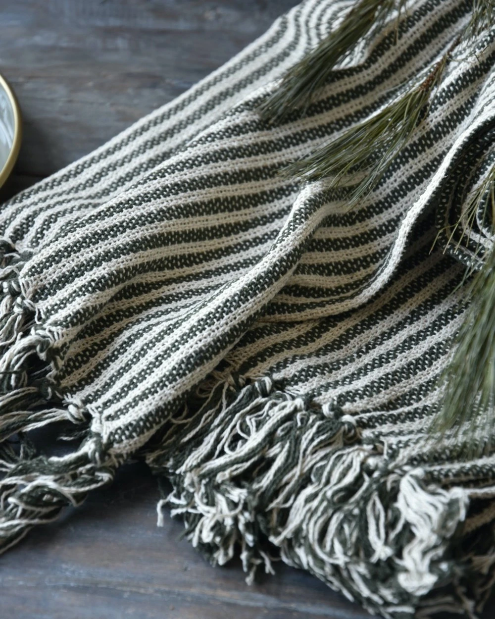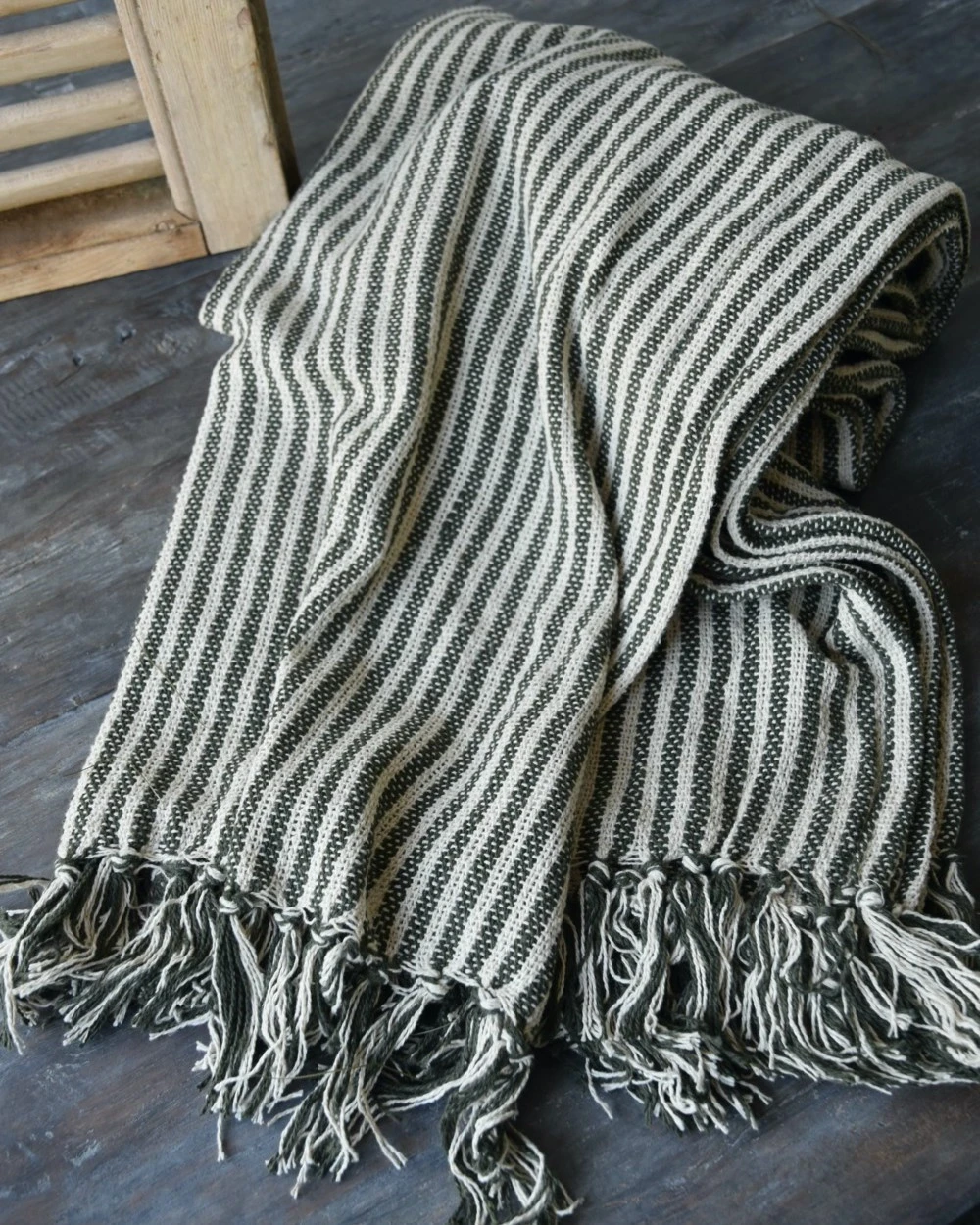 Geweven Sprei Olijfgroen Gebroken Wit Gestreept Met Kwastjes, IB Laursen
