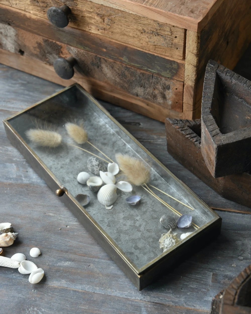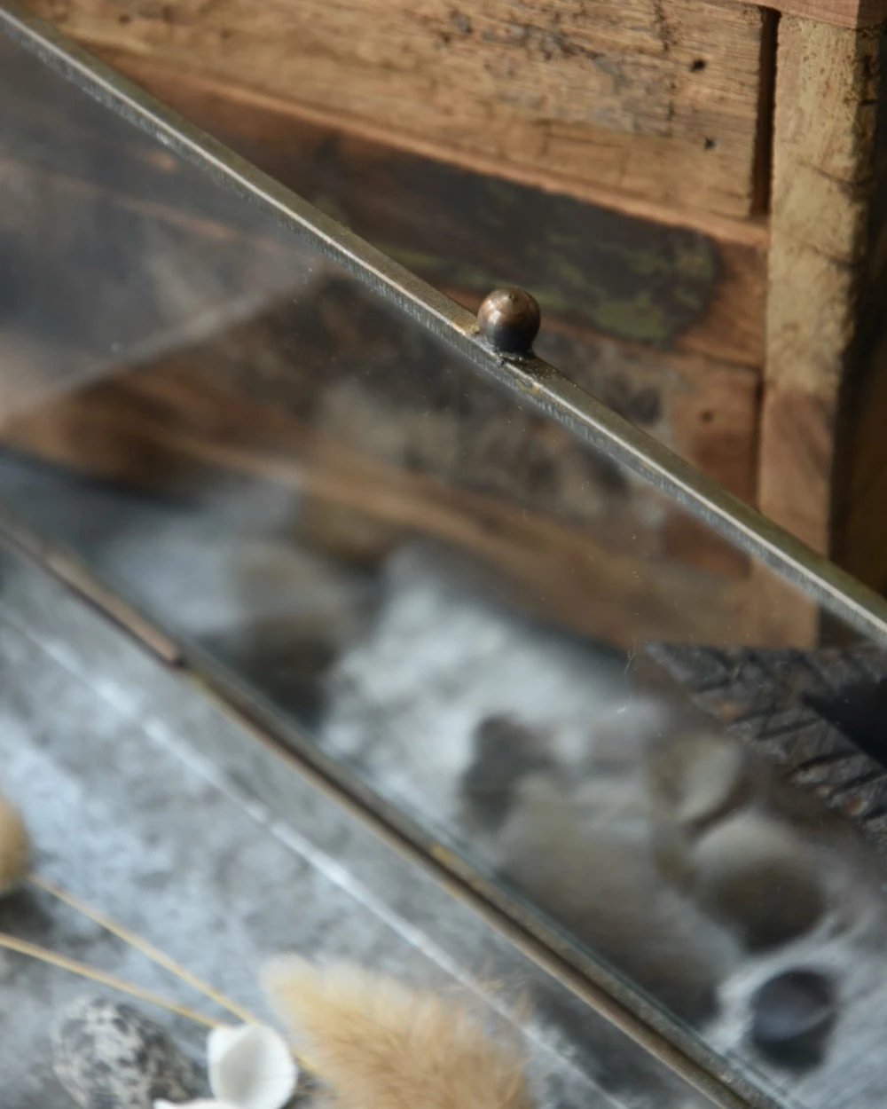 Glazen kistje in antiek-look met zinken bodem, IB Laursen. Dit leuke kistje is van metaal met een antiek-look handgemaakt met een glazen deksel. De bodem aan de binnenkant is in zink en de buitenkant zowel de zijkanten, bodem en deksel frame met knopje heeft de antiek-look. Het kistje is langwerpig en kan worden gebruikt om mooie vondsten in uit te lichten, of een mooi sieraad, schelp of kaartje…., ook wordt het kistje vaak op de kaptafel gebruikt met bv wat armbandjes e.d. Het kistje is met de hand afgewerkt waardoor ieder kistje een uniek uiterlijk heeft en daardoor ook zijn eigen oneffenheden. Dit hoort bij de charme van het product.