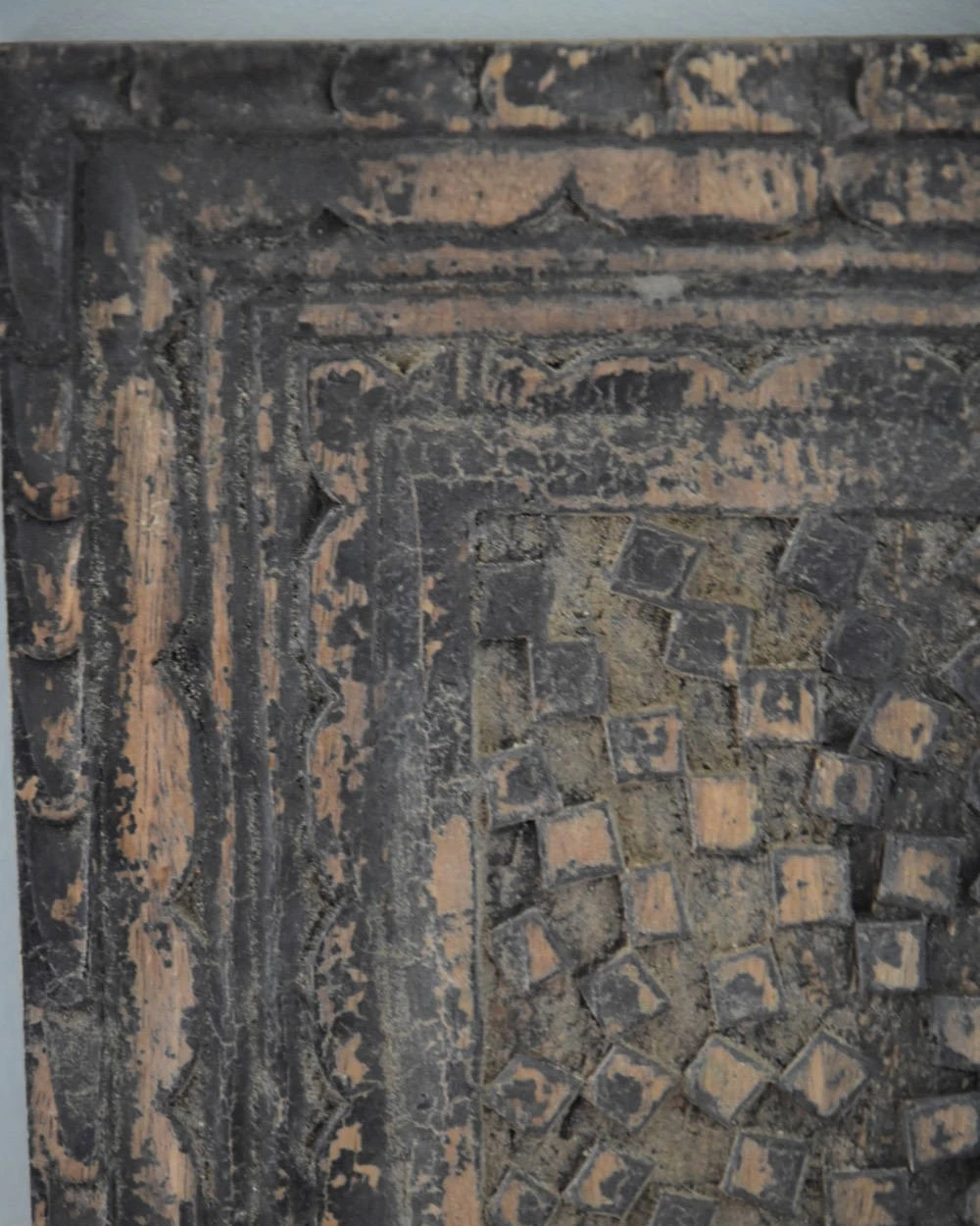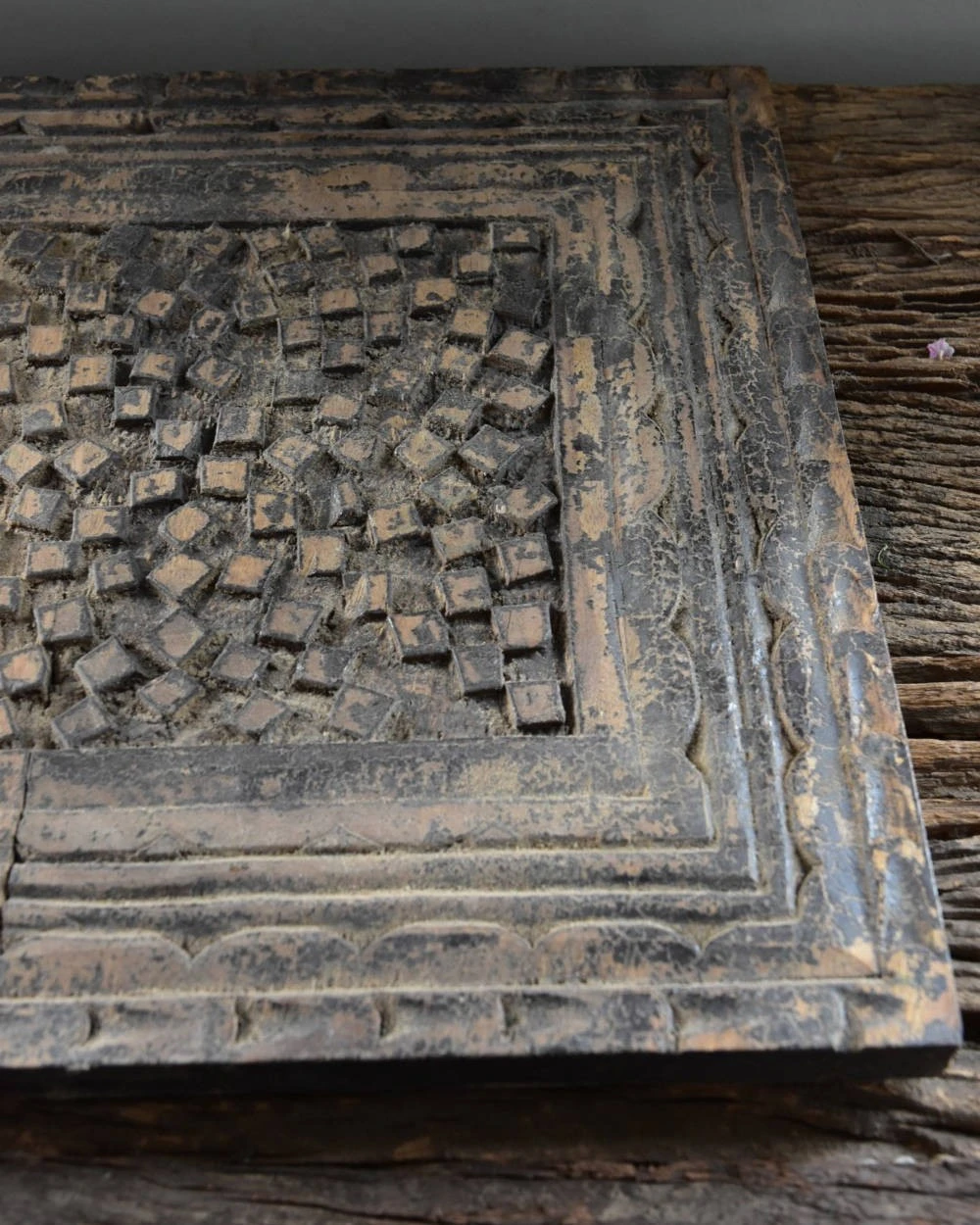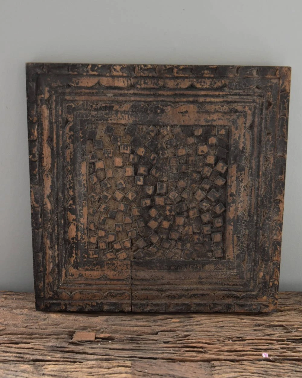 Grijs houtsnijwerk paneel van Be-Uniq. Dit vierkanten paneel heeft een mooie greywash look. Het houtsnijwerk komt hierdoor goed uit. het paneel is geschikt om ergen tegen de muur te zetten maar u kunt hem ook als sierplank op de tafel leggen en er bv wat stoere kandelaren op zetten.