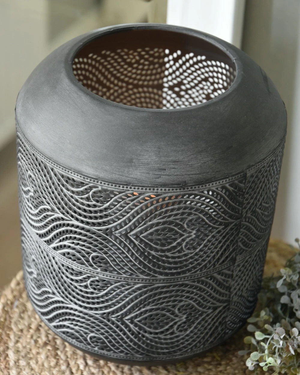 Groot rond metalen windlicht met glooiend gaatjes patroon. Dit prachtige grote windlicht heeft een mooi glooiend patroon (met hartje erin), is rond, van metaal en met sfeervolle gaatjes die mooie lichtschijnsel op de muur geven. Het metaal donker van kleur met lichtere poederachtige accenten zodat het mooie patroon goed tot zijn recht komt. In het windlicht zit een houder met een glas waarin u de kaars kunt plaatsen, zodat deze veilig en windvrij kan branden.