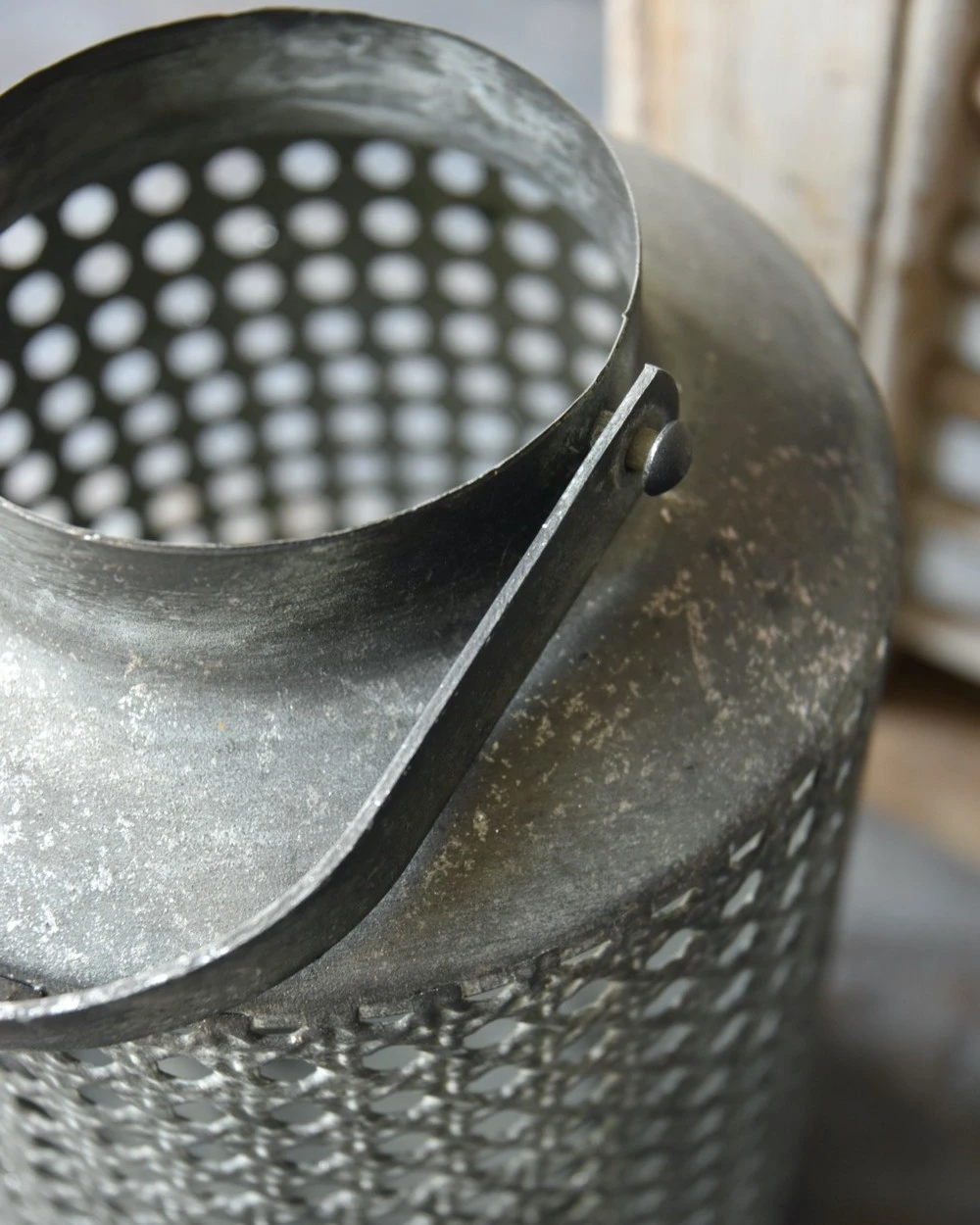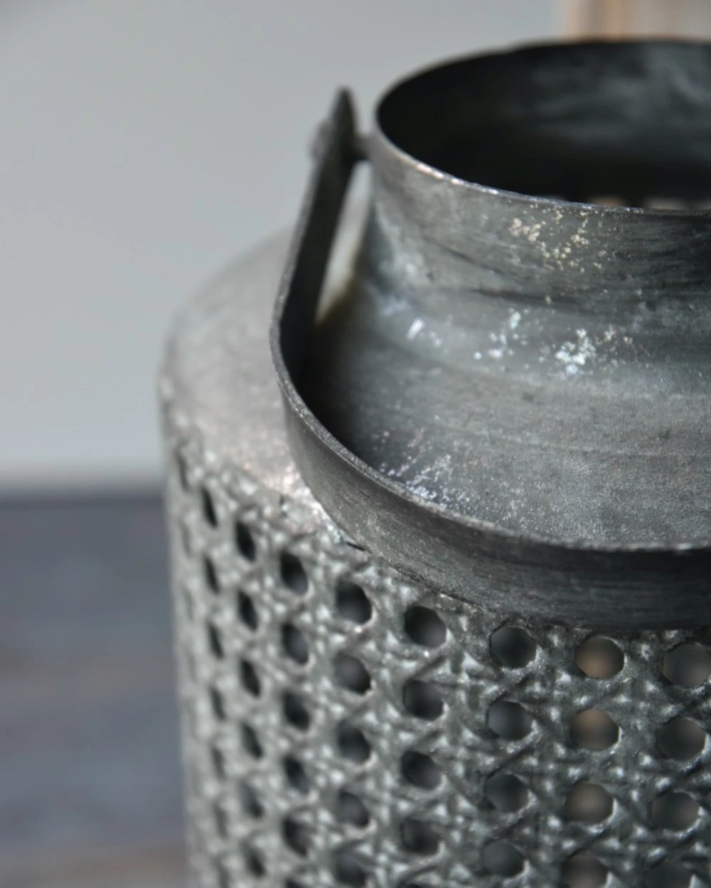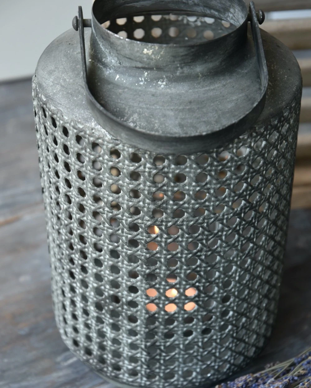 Hoge lantaarn van metaal met gaatjes patroon en hengsel per stuk. Deze prachtige lantaarn is van metaal gemaakt in een grijzige kleur en heeft een patroon van ‘gevlochten’ gaatjes die met een licht accent mooi tot zijn recht komen. In de lantaarn zit een klein cilinderglas waar u een kaars of waxinelicht in kunt branden. De lantaarn/windlicht heeft een iets smaller voet met daarop een groot gedeelte die recht omhoog gaat waar het gaatjes patroon in zit, waarna hij weer smaller wordt tot een mooie hals met een hengsel.Â