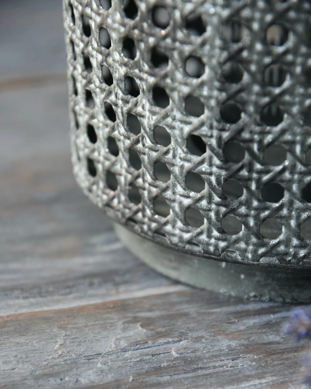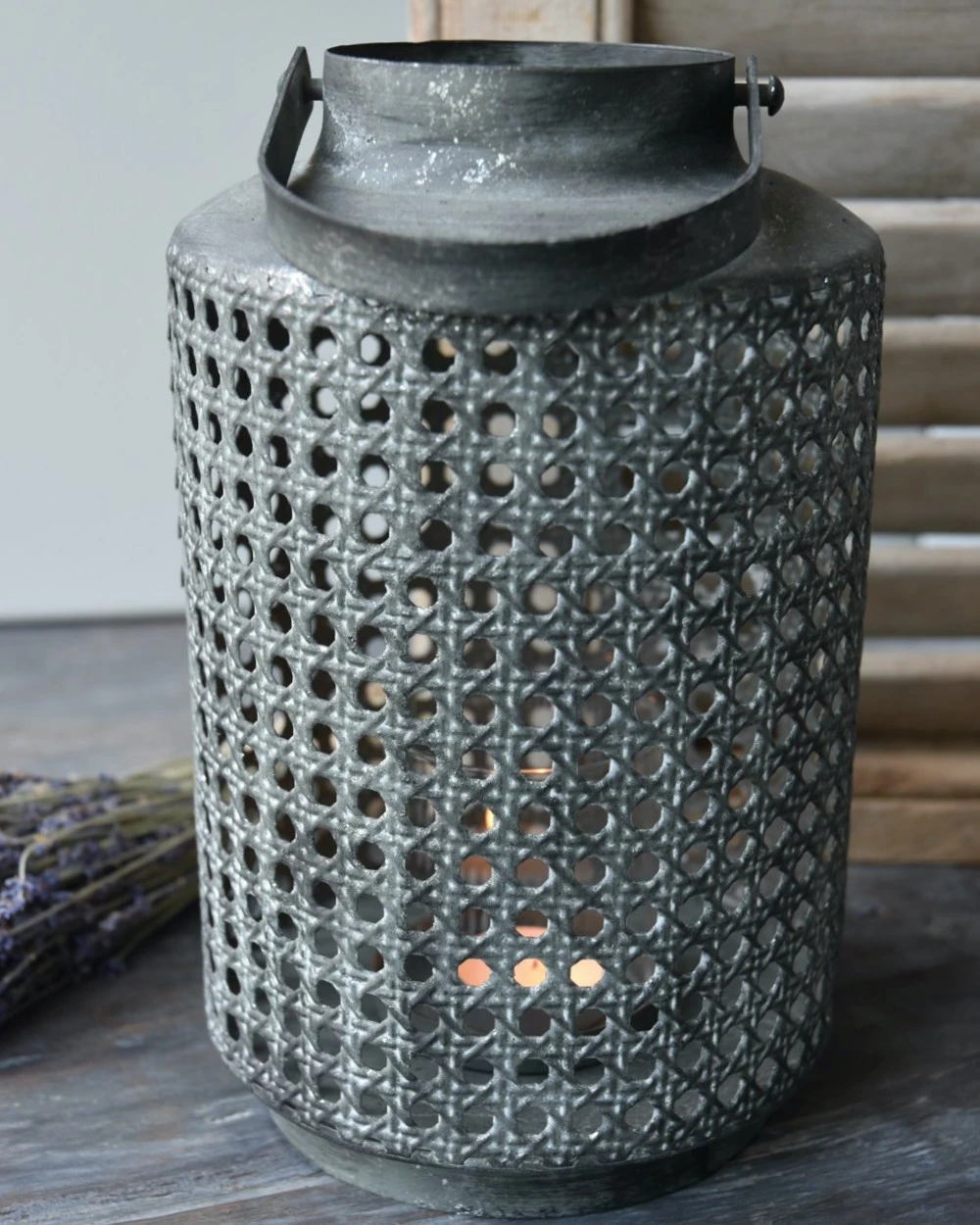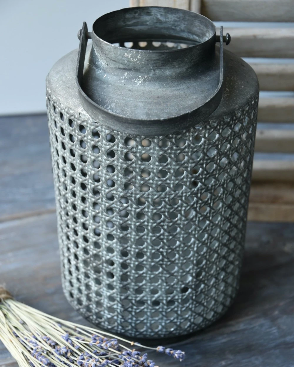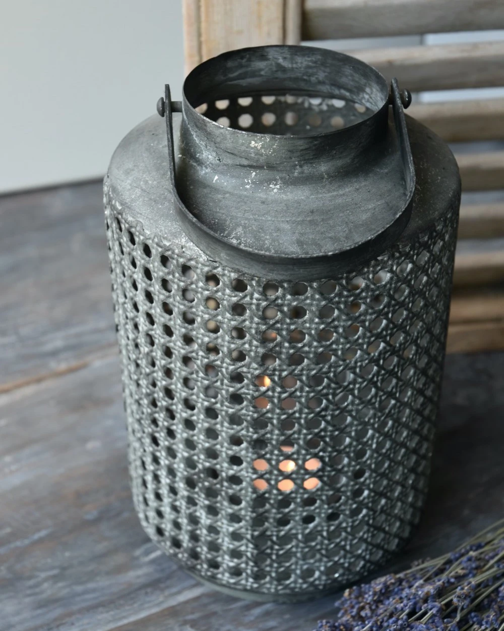 Hoge lantaarn van metaal met gaatjes patroon en hengsel per stuk. Deze prachtige lantaarn is van metaal gemaakt in een grijzige kleur en heeft een patroon van ‘gevlochten’ gaatjes die met een licht accent mooi tot zijn recht komen. In de lantaarn zit een klein cilinderglas waar u een kaars of waxinelicht in kunt branden. De lantaarn/windlicht heeft een iets smaller voet met daarop een groot gedeelte die recht omhoog gaat waar het gaatjes patroon in zit, waarna hij weer smaller wordt tot een mooie hals met een hengsel.Â