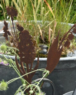 Hyacint met bol op prikker, metaal roest. Deze 2D prikker van een Hyacint in volle bloei, heeft aan dit ontwerp ook de bol en het blad, wat een leuk effect geeft. U kunt de Hyacint zo in de grond of in een bloembak zetten. In alle seizoenen staat de roestkleur mooi en heeft een sfeervol effect.