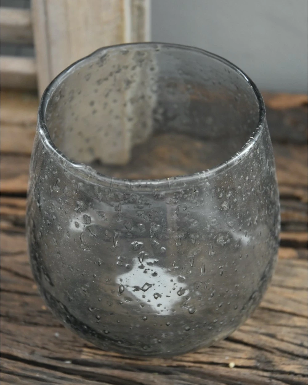 Iets bolle glazen vaas met bubbels, zilvermetaal en grijze gloed per stuk. Deze mooie glazen pot heeft een iets grijze gloed en in het glas zitten zilvermetaal splinters en bubbels verwerkt voor een mooi effect. Het model is van onder iets bol en loopt iets taps naar boven. Het glas kan heel mooi worden gebruikt als windlichtje met bv wat schelpen als decoratie.Â