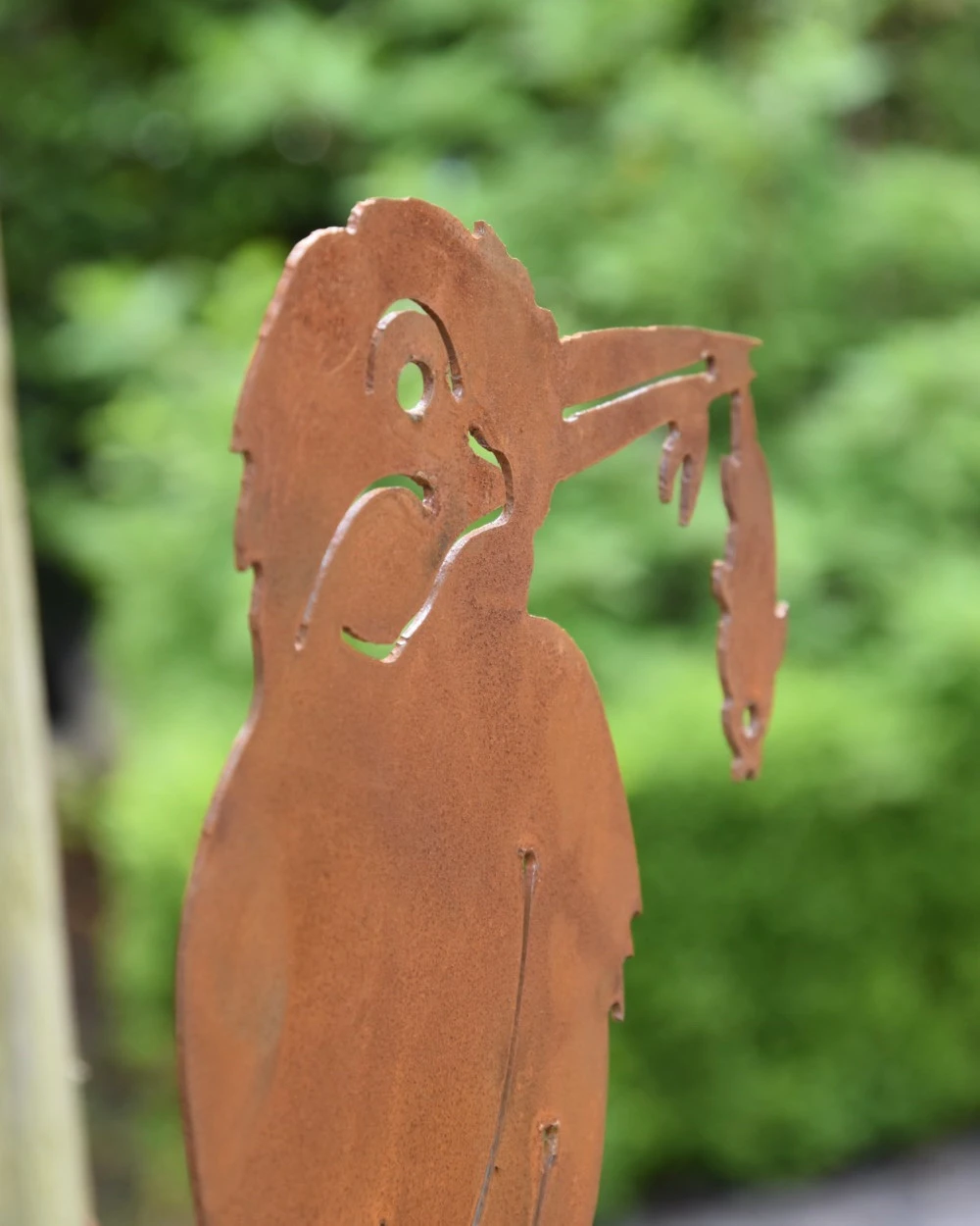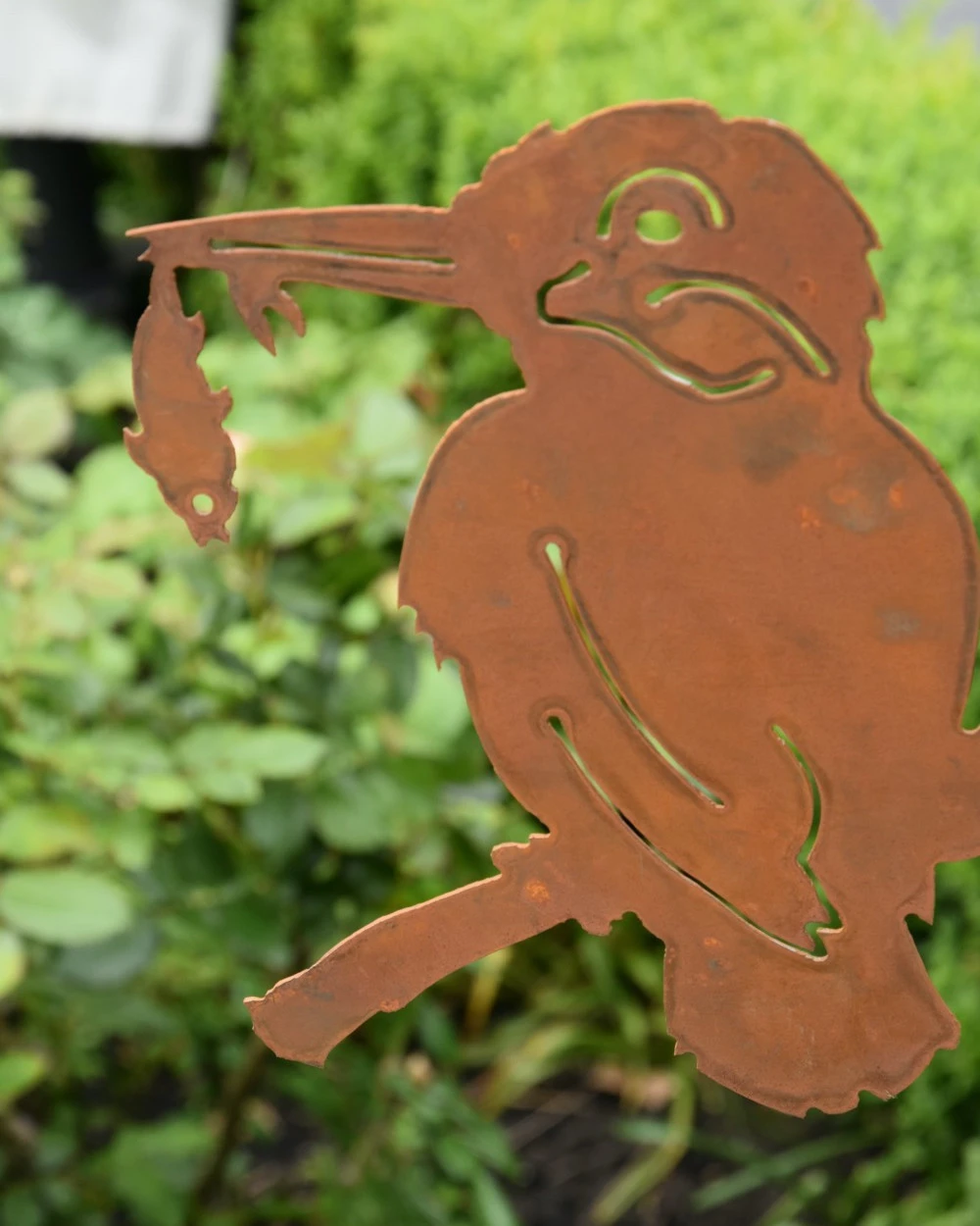 IJsvogel met visje op tak, Metalen schroefvogel. Deze leuke IJsvogel als tuin decoratie heeft een klein net gevangen visje in zijn bek en zit op een takje. De tuinvogel is van metaal gemaakt die door een speciale behandeling een mooie roestlaag heeft gekregen wat een warm en natuurlijk effect geeft. U kunt de vogel zo met de schroef aan een paal zetten bijvoorbeeld. Ook is het leuk om hem bv bij een vijver of watertje te hangen alsof hij daarin heeft gevist….