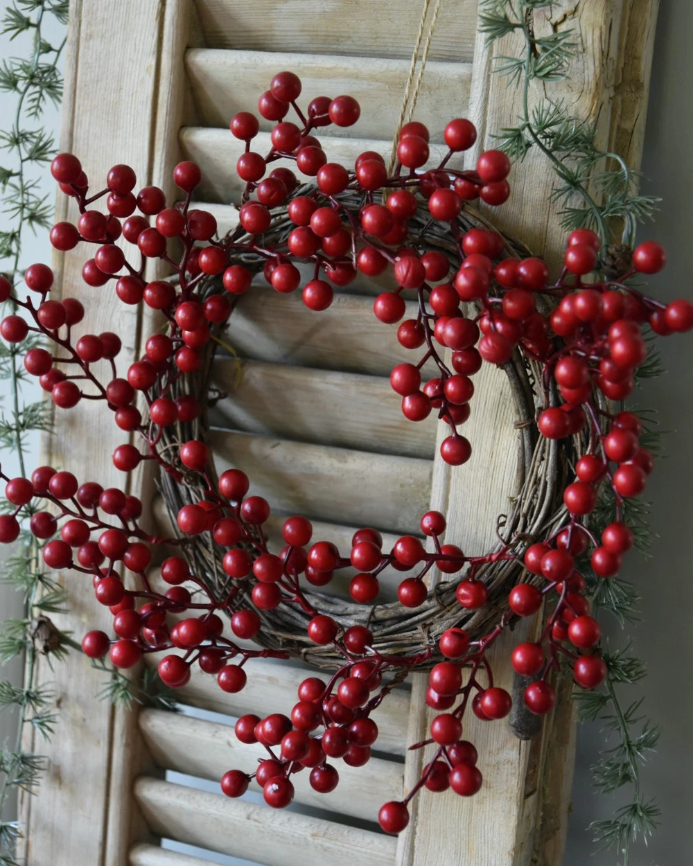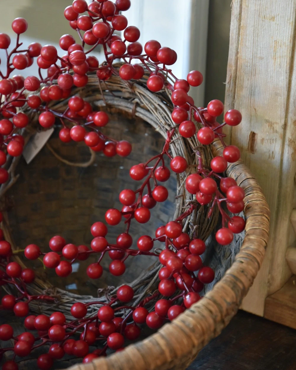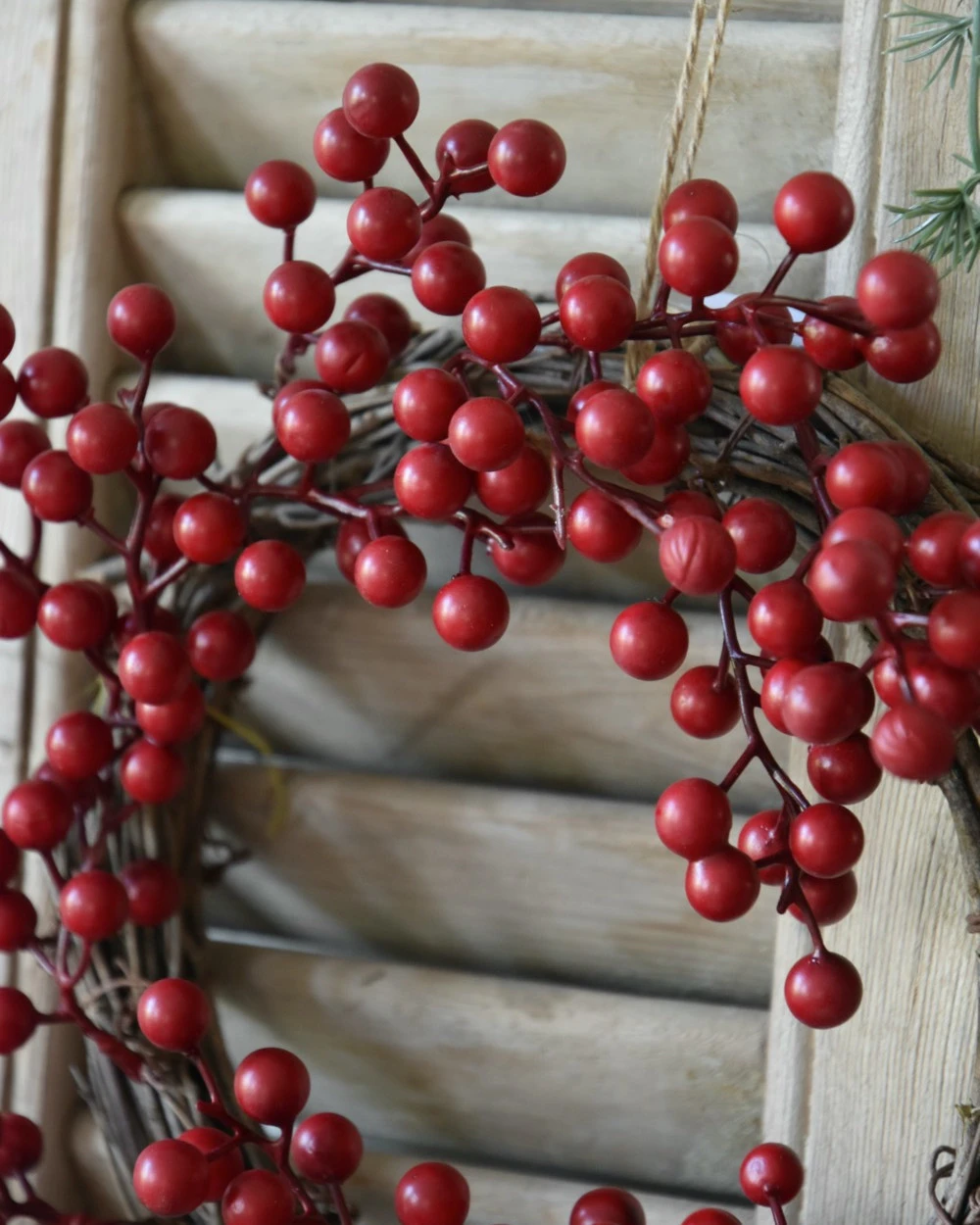 Krans van rode besjes, IB laursen. Deze krans vol met diep rode bessen zit op een bruin takken frame. U kunt de bessen nog naar wens voorzichtig in de voor u juiste positie buigen. De rode bessen zitten op takken en hebben een warme kleur die heel goed in het najaar en de winter bv past. Ook met de kerstdagen is dit een heel leuk exemplaar. Aan de krans zit een jute touw waarmee u hem eventueel kunt ophangen.
