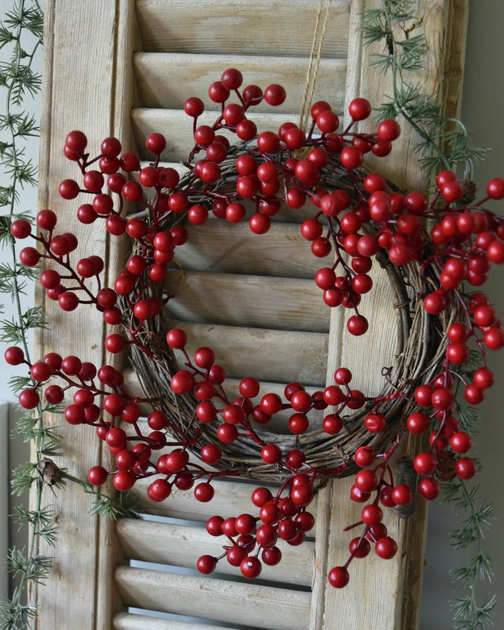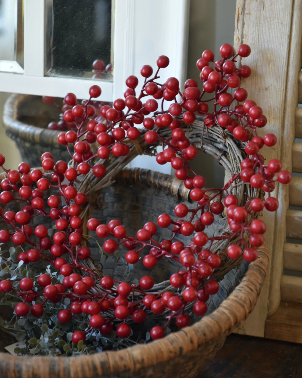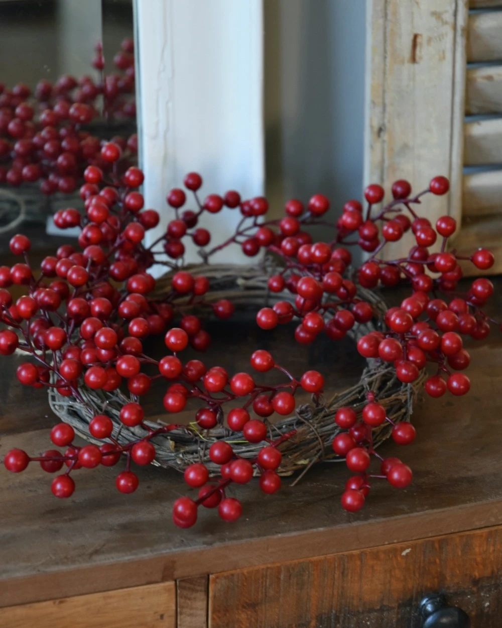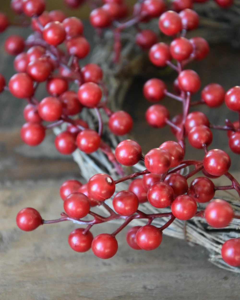 Krans van rode besjes, IB laursen. Deze krans vol met diep rode bessen zit op een bruin takken frame. U kunt de bessen nog naar wens voorzichtig in de voor u juiste positie buigen. De rode bessen zitten op takken en hebben een warme kleur die heel goed in het najaar en de winter bv past. Ook met de kerstdagen is dit een heel leuk exemplaar. Aan de krans zit een jute touw waarmee u hem eventueel kunt ophangen.