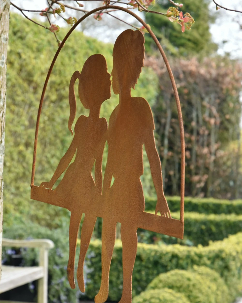 Meisje en jongen geven elkaar een kusje, hangend ecoroest. Deze leuke grote silhouet ecoroest hanger waar een jongen en een meisje elkaar een kusje geven hangd aan een ketting die u gemakkelijk in de tuin aan de pergola, schutting of in een boom kunt hangen. Samen zitten ze op een schommel/balk en het silhouet meisje heeft een jurkje aan en een lange paardenstaart, de jongen een korte broek en shirt en kort haar. Aan de schommel/balk zit een gebogen stijl waar de ketting ook aan vast zit. Een lieflijk en gezellig tafereel om de tuin mee op te sieren.