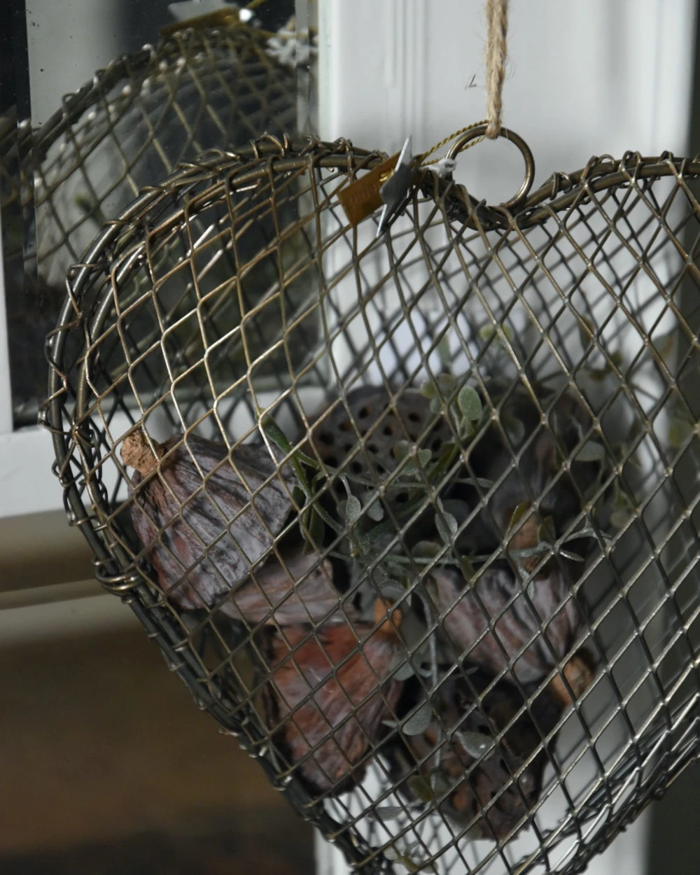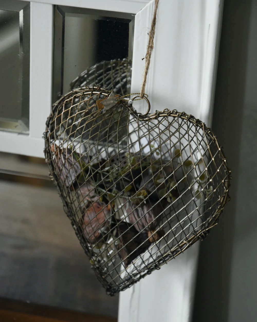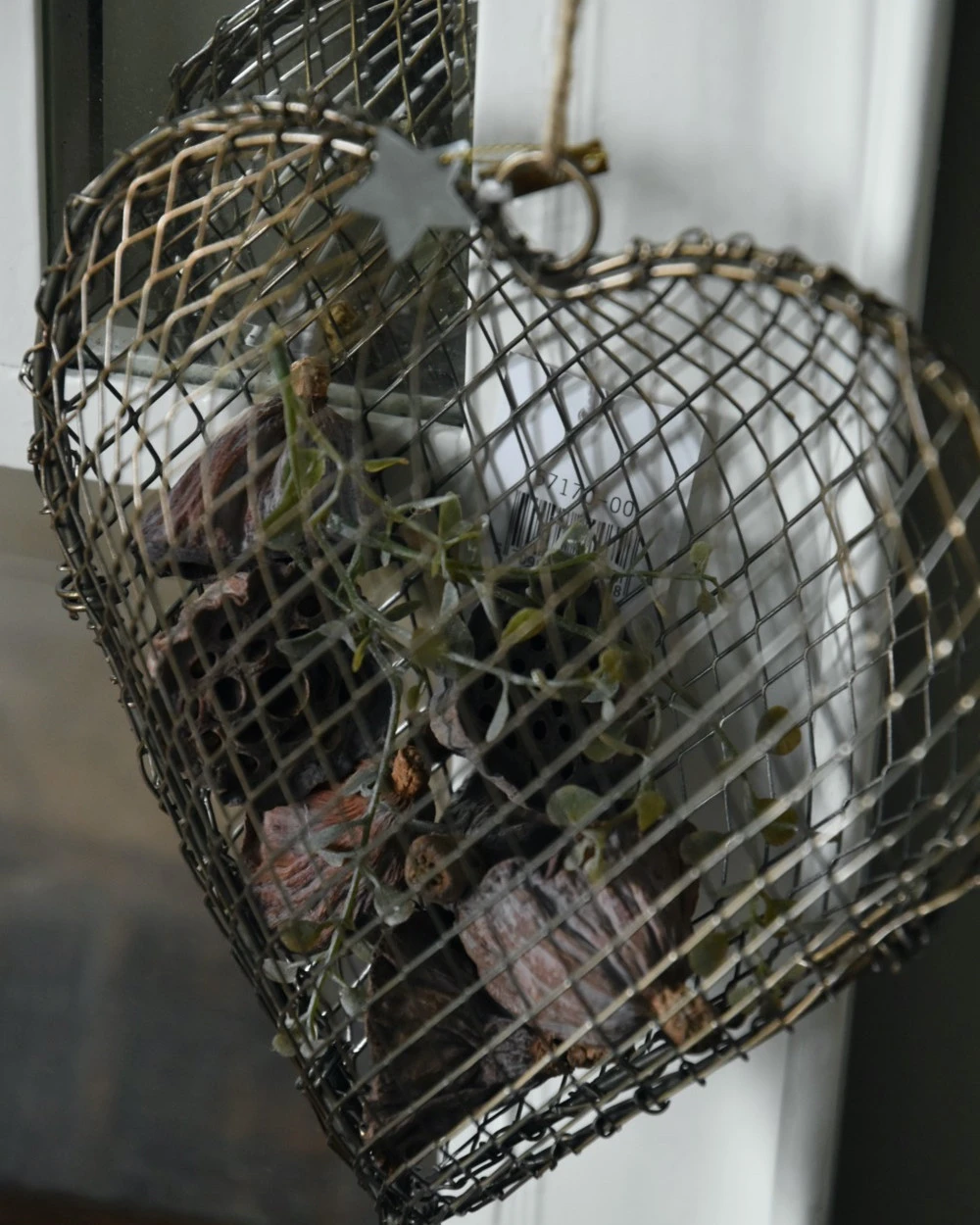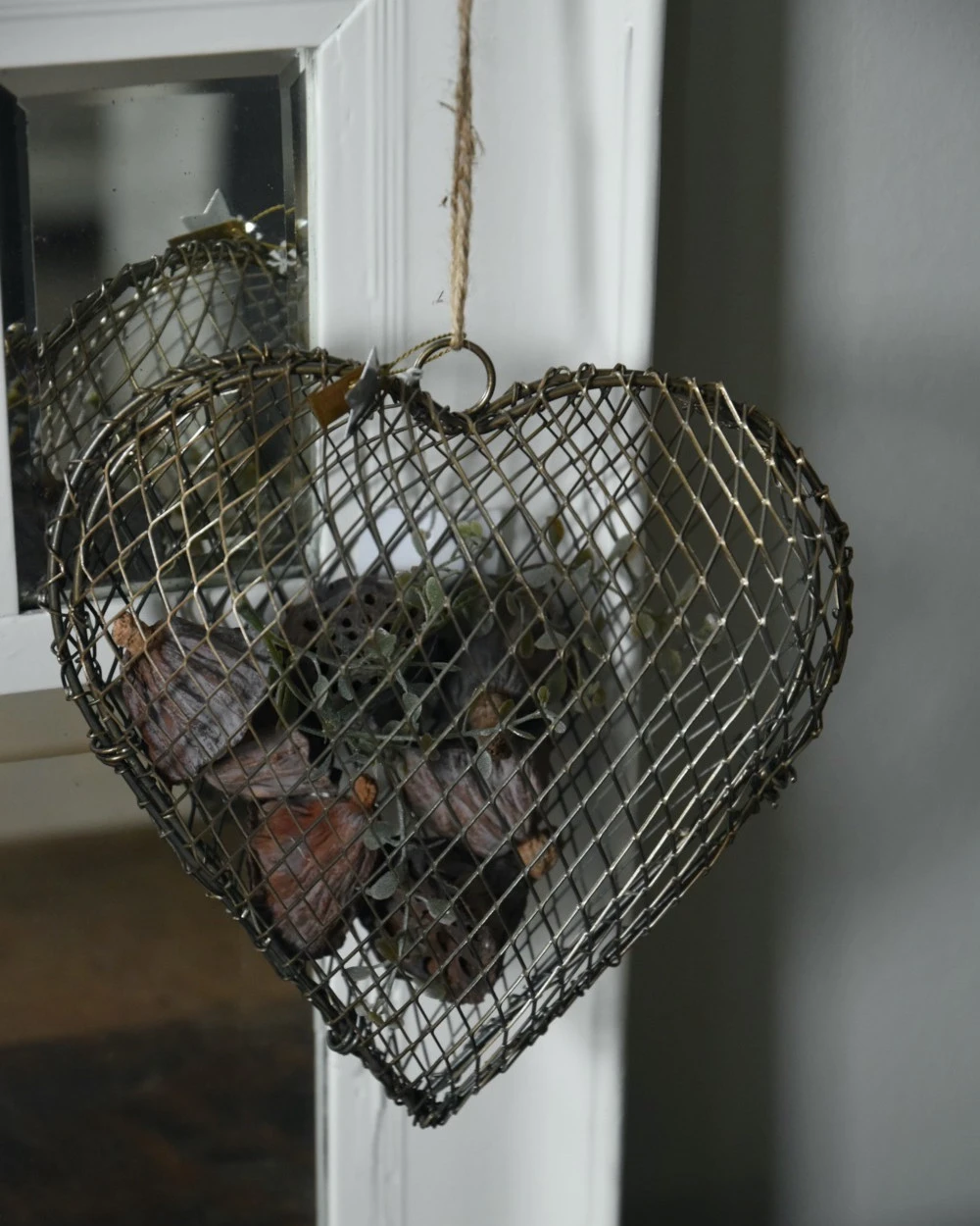 Metalen draad hart antiek look met touw vulbaar, IB Laursen. Deze leuke draadmand in vorm van een hart wat naar wens gevuld kan worden is van metaal in een antiek look. Het hart kan met een sluitinkje worden geopend en gesloten. Aan het hart zit een lange jute lus waarmee u het hart eventueel kan ophangen. U kunt het hart leuk vullen met kegeltjes, ballen, groen of gedroogde bloemen en door het gaas effect zien.