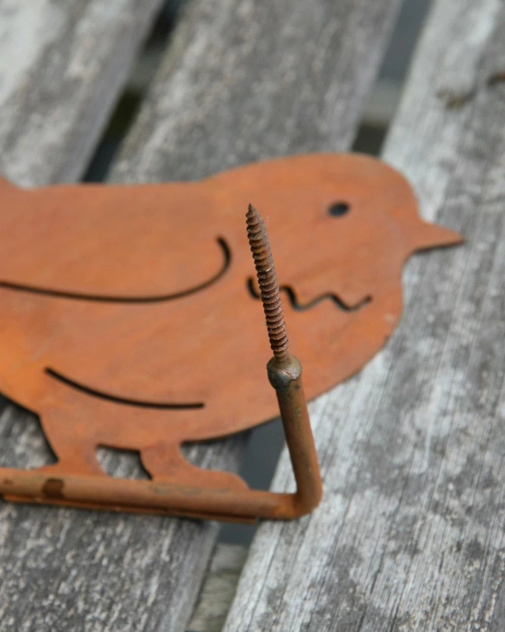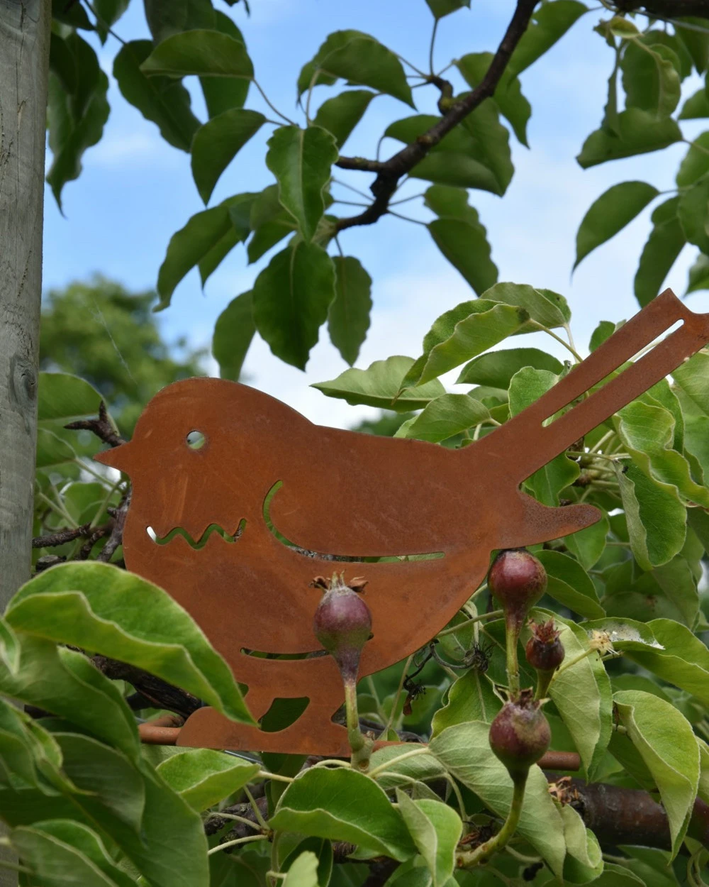 Metalen tuin vogel Mus op takje. Deze schroef vogel het Musje zit op een tak/stokje, de Mus is in een mooi silhouet en kan met de schroef zo in een boompaal of schutting bv worden geschroefd. Zo heeft u altijd een leuk vogeltje in de tuin in een warme roestkleur. Het stokje/takje gaat om de hoek zodat u een leuk 3D effect heeft waar het vogeltje geplaatst wordt.