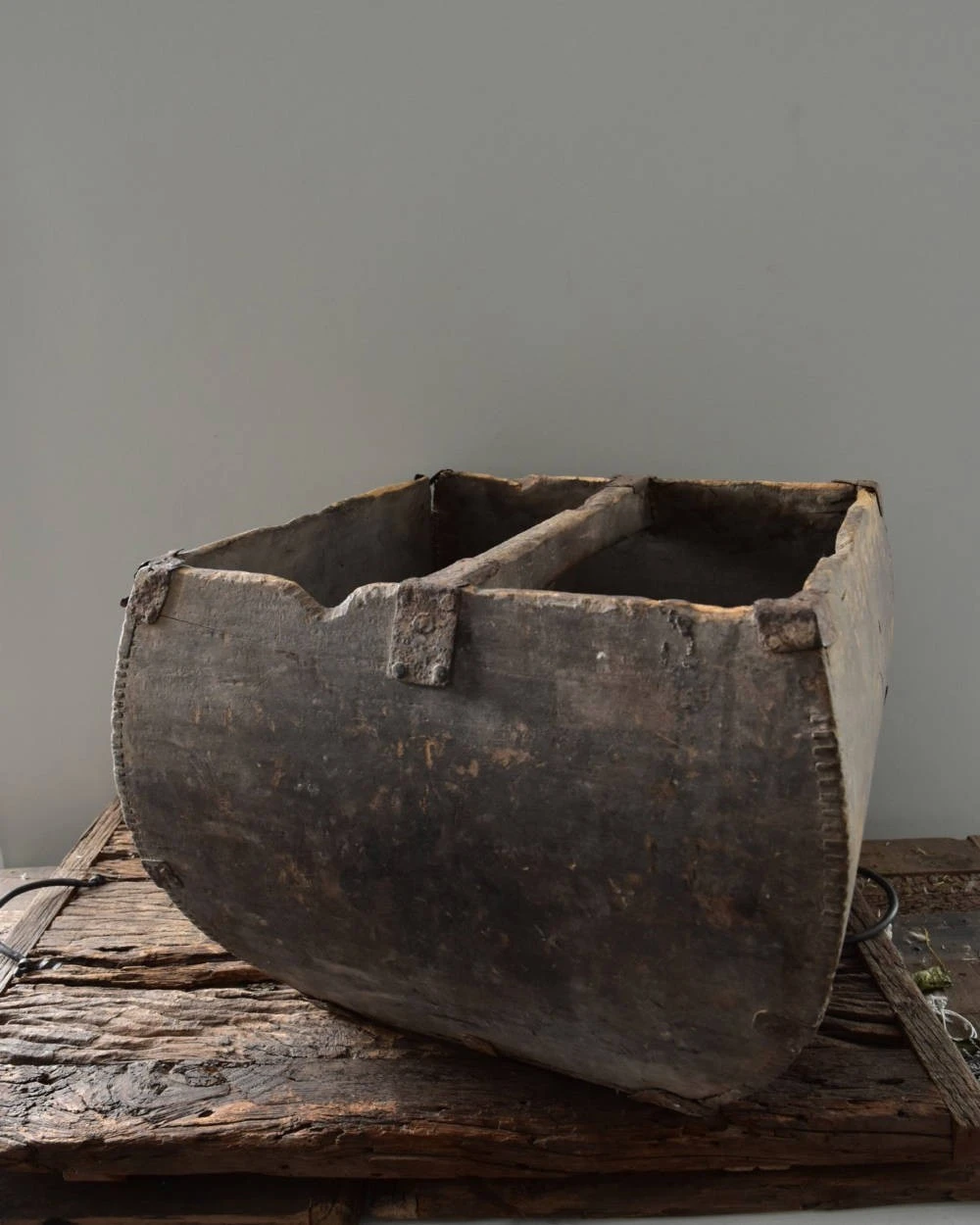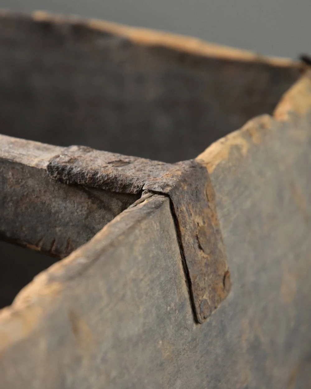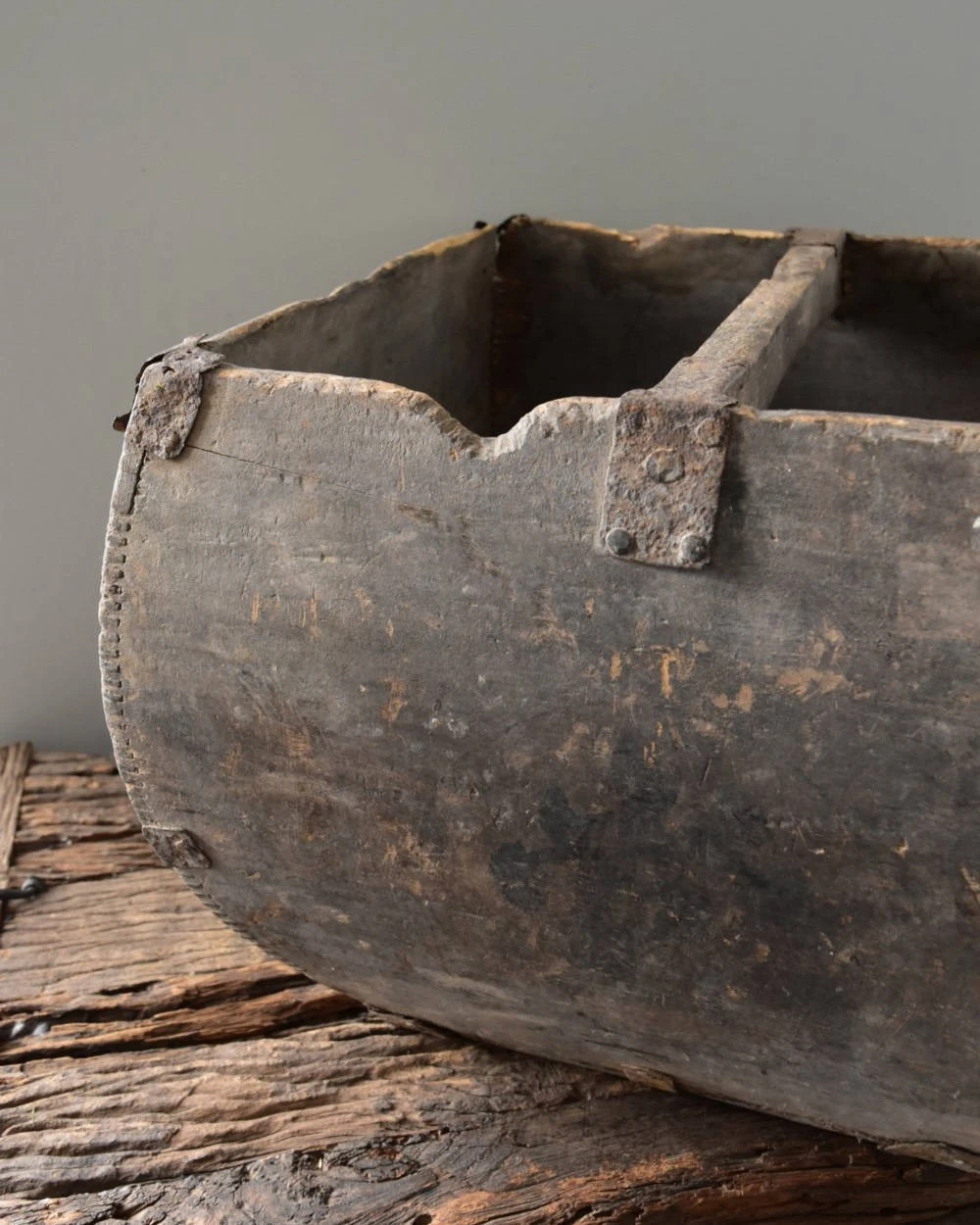 Oude rijstmaat China met prachtige details. Deze unieke oude rijstmaat heeft prachtige gebruikers sporen. Zo zijn er wat beschadigingen en de metalen binten zijn iets geroest. Hierdoor heeft de grijzige houten rijstmaat een geweldige uitstraling. In het middel is een handvat en de prachtige verbinding van het hout is goed zichtbaar. De rijstmaat is van boven vierkant en hij loopt met een ronding smaller naar beneden.