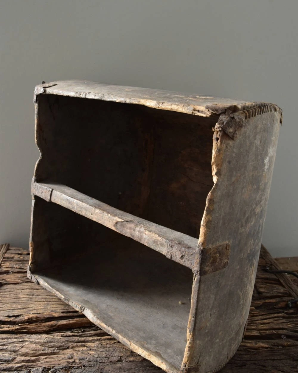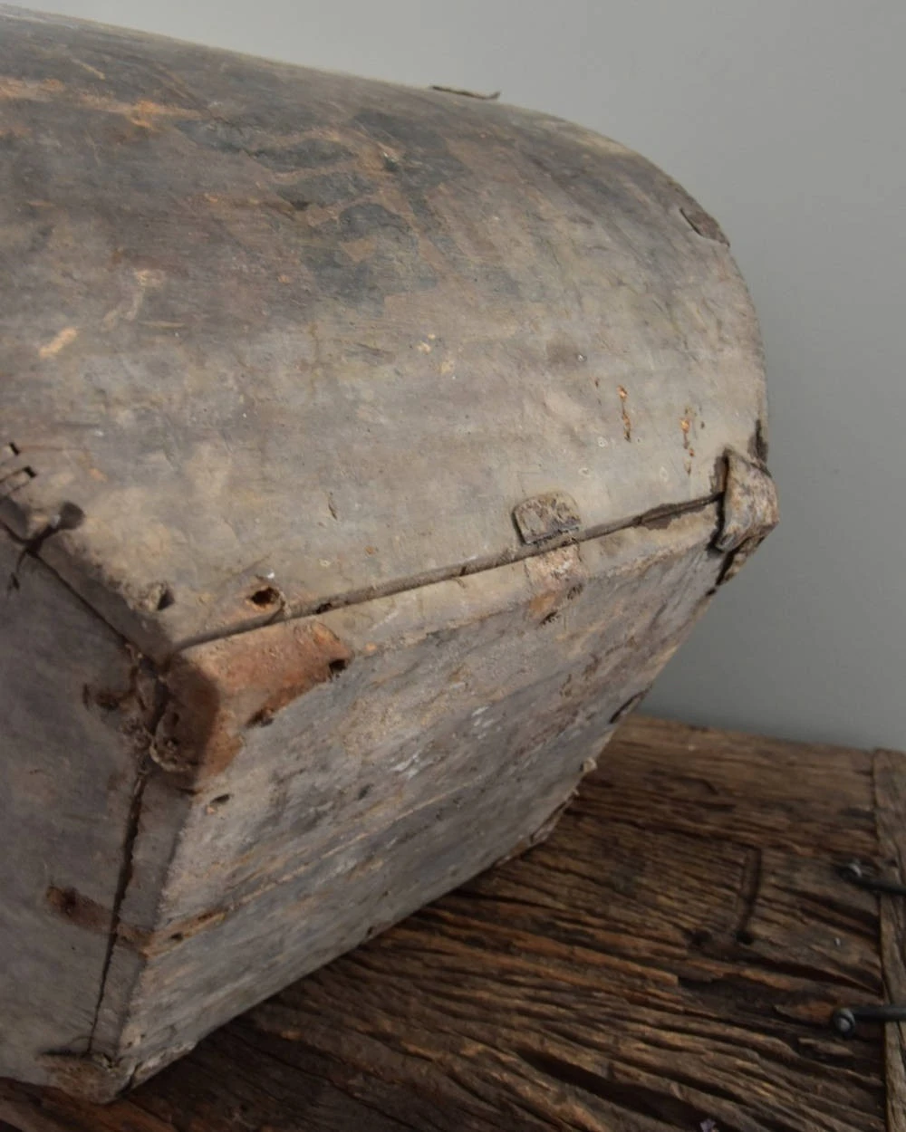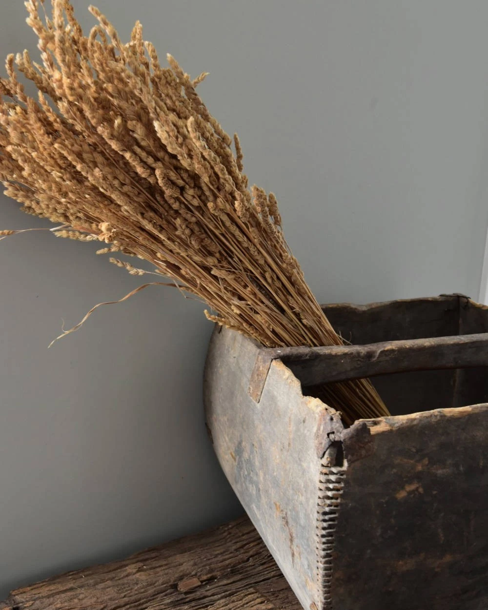 Oude rijstmaat China met prachtige details. Deze unieke oude rijstmaat heeft prachtige gebruikers sporen. Zo zijn er wat beschadigingen en de metalen binten zijn iets geroest. Hierdoor heeft de grijzige houten rijstmaat een geweldige uitstraling. In het middel is een handvat en de prachtige verbinding van het hout is goed zichtbaar. De rijstmaat is van boven vierkant en hij loopt met een ronding smaller naar beneden.