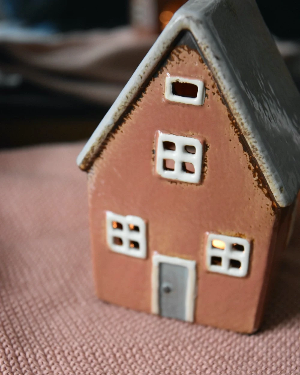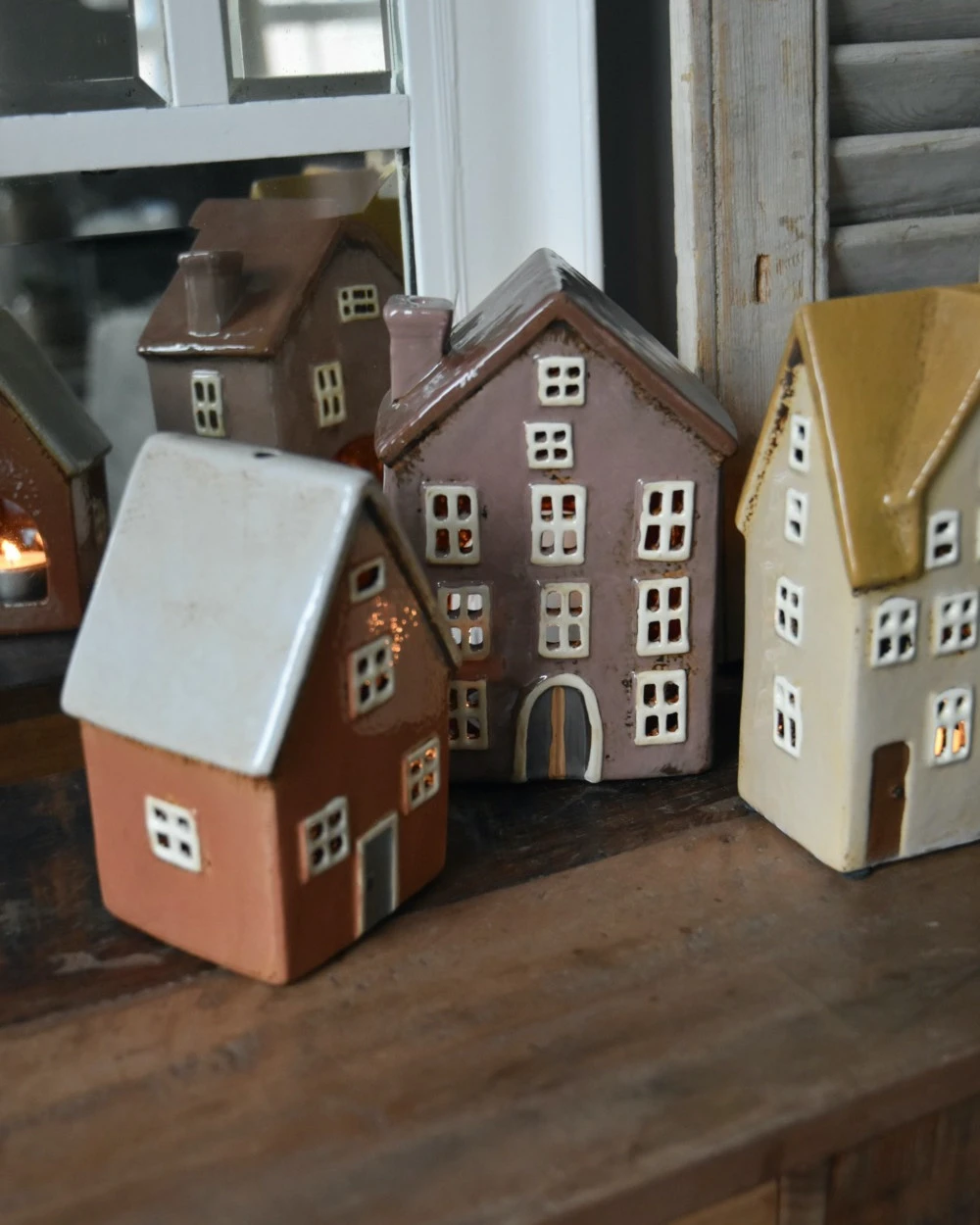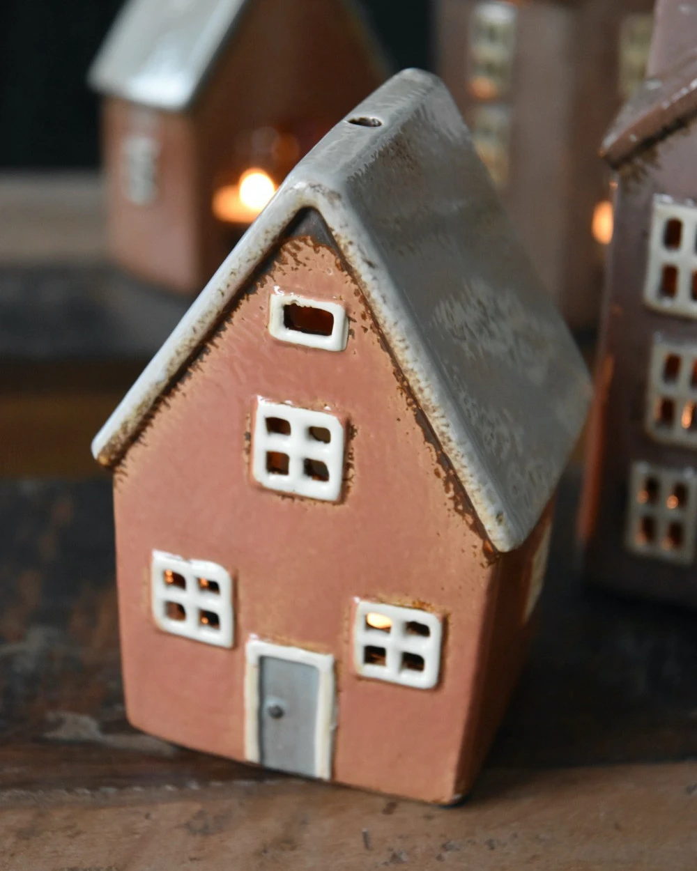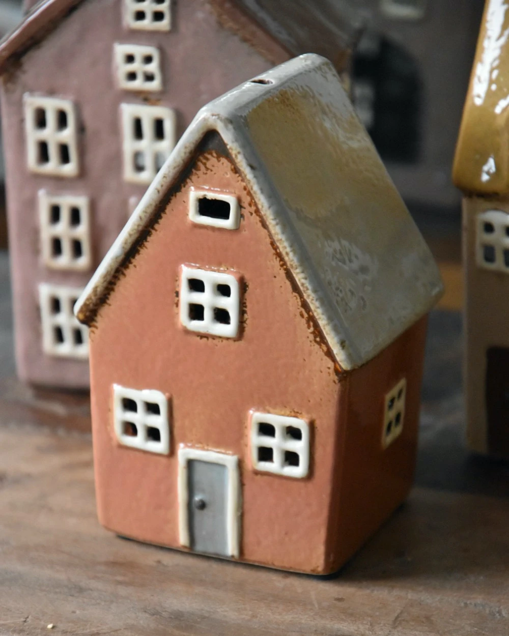 Pastel perzik kleurig theelicht huisje Nyhavn, IB Laursen. Dit leuke huisje van keramiek is in een mooie warme perzik kleurige pastel tint. Het huisje heeft open ramen zodat het licht er mooi door kan schijnen. De voordeur is zacht grijs en het punt dak heeft een klei witte tint. Aan de achterzijde zit een gat waar u een waxinelichtje in kunt zetten voor een mooi en gezellig schijnsel. U kunt de huisjes naar lust combineren en zo uw eigen dorp creëren. Het huisje is geïnspireerd op de Deense havenplaats Nyhavn die typeert met de gekleurde pakhuizen.Â