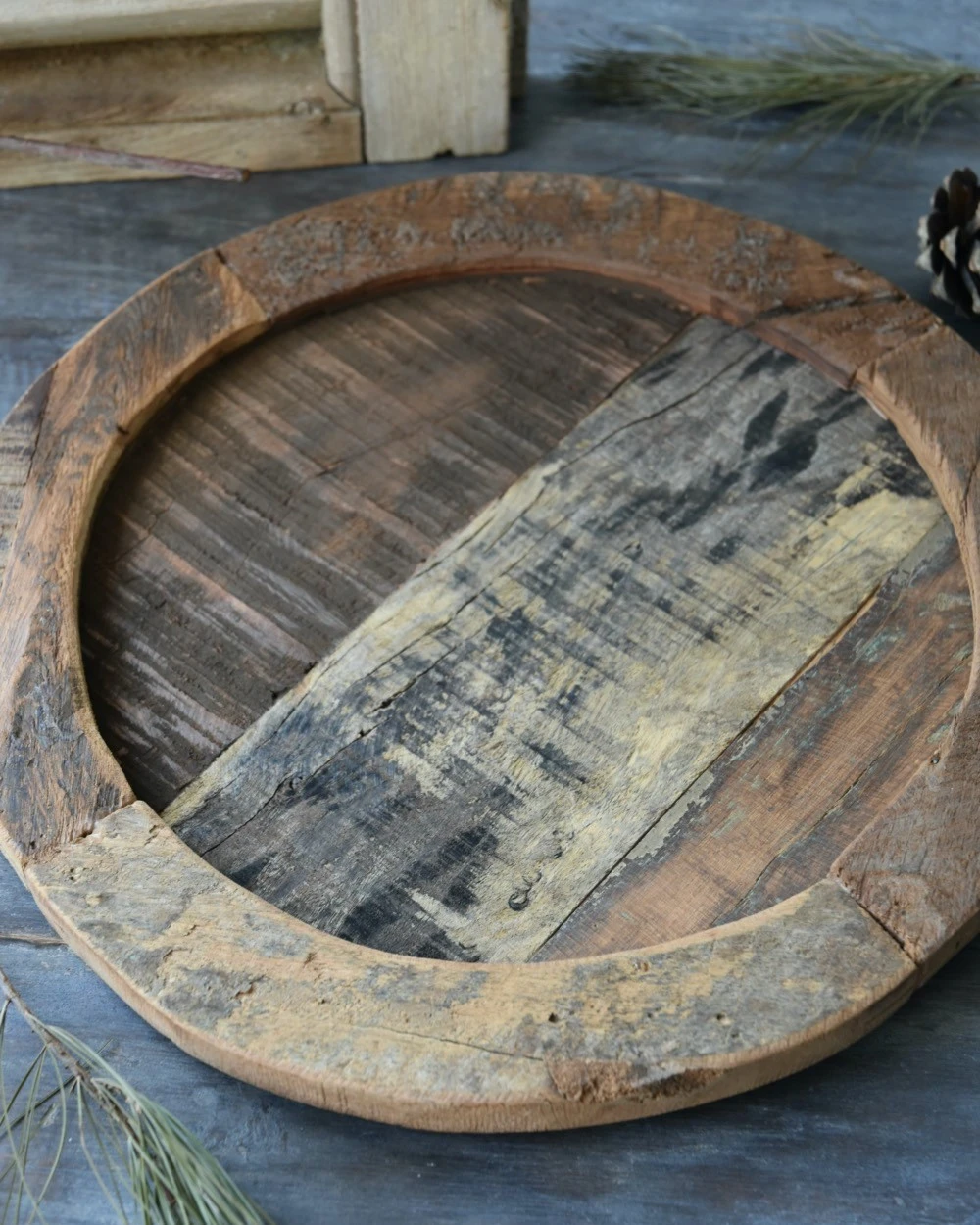 Ronde oud houten plateau, IB Laursen. Dit ronde plateau is gemaakt van gebruikt hout wat vol karakter is. Het ronde model heeft een rand die iets hoger is, door het gerecyclede hout is ieder plateau uniek met zijn eigen kenmerken. U kunt het plateau gebruiken voor kaarsen, kandelaren, een gezellig plantje……… De tray komt uit de Unique collectie van het Deense merk IB Laursen.
