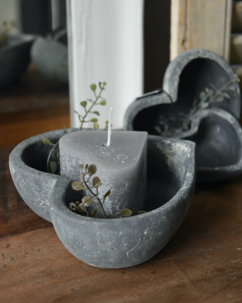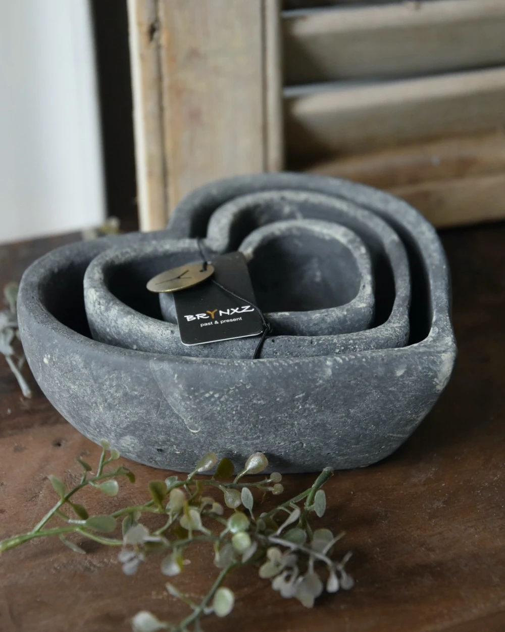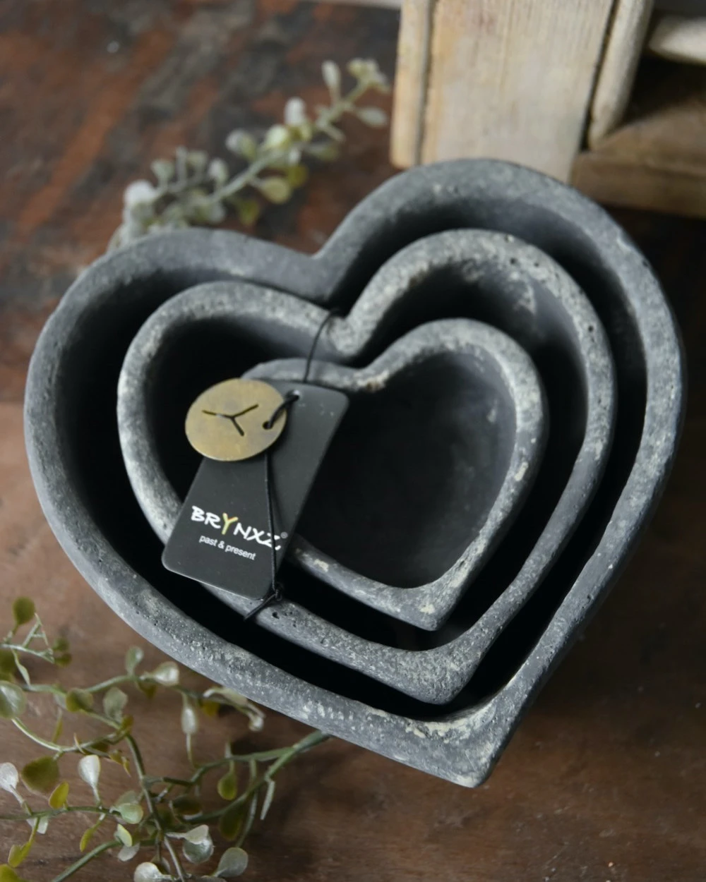 Set van 3 hart schaaltjes Majestic Brynxz. Dit leuke set met schaaltjes in vorm van een hart is in drie opeenvolgende maten. U kunt de hartjes mooi in elkaar zetten of juist naast elkaar plaatsen met bv kaarsen of waxinelichtjes erin. Het set is gemaakt van aardewerk en in de Majestic grijze afwerking. U kunt ze bv vullen met mooie kerstballen, later met bolletjes en mos (gebruik dan plastic om doorlekken te voorkomen) of gezellig met kleine decoraties en groen……
