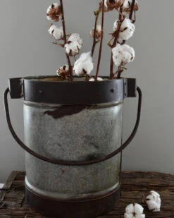 Stoere vintage emmer met hengsel, en unieke details. Zware kwaliteit met mooie veroudering als deukjes en verfspatten. Een prachtige aanwinst voor uw interieur. De emmer is zwaar en staat mooi met een olijfboompje of citrusboompje, of met wat takken bijvoorbeeld. Ook leuk om met de kerst een kleine kerstboom in te zetten.