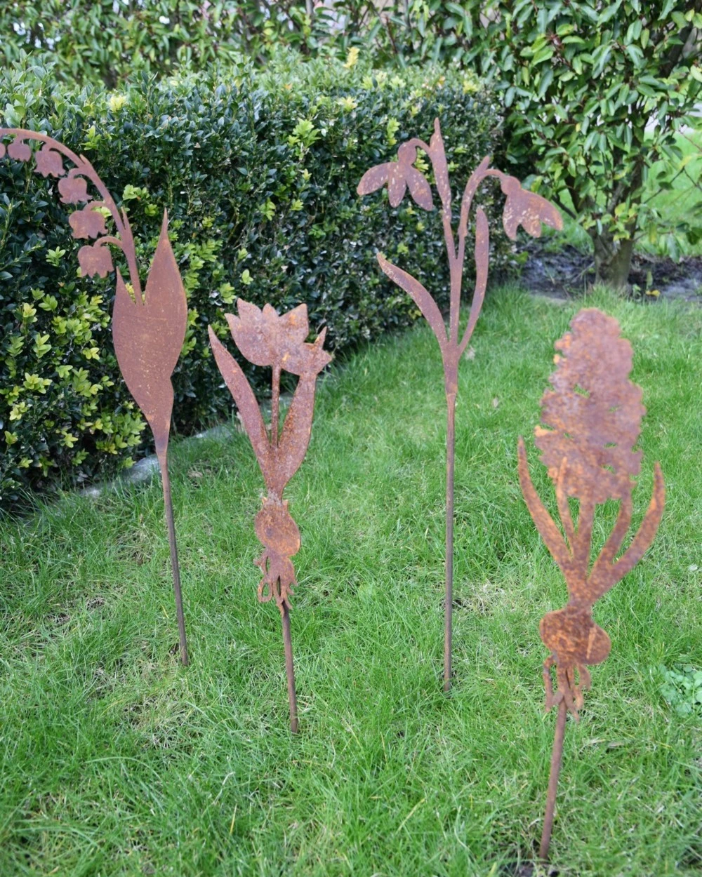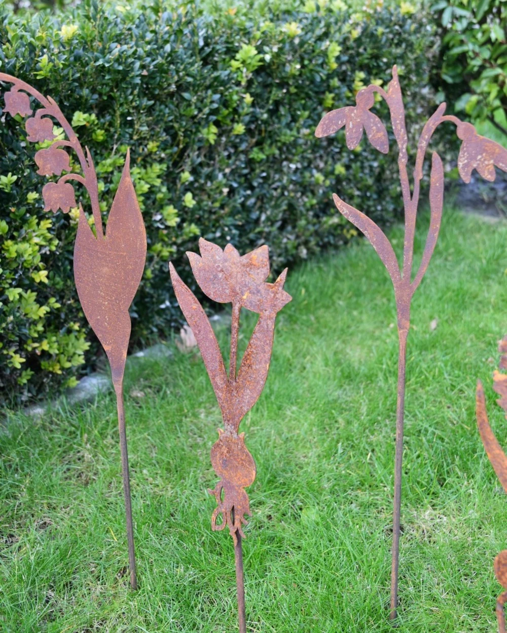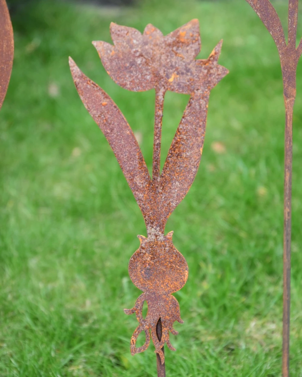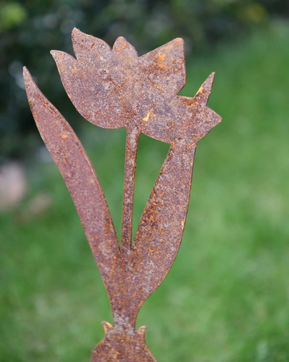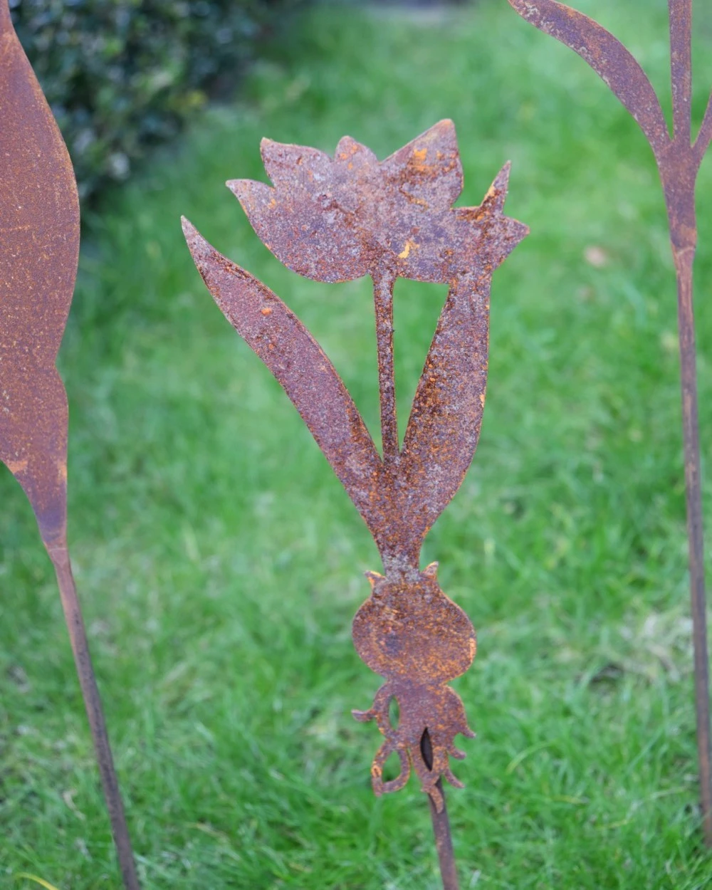Tulp op prikker, metaal roest per stuk. Deze leuke 2 D bolbloem is van metaal gemaakt wat met een speciaal proces mooi geroest is. De tulp is met blad en bol uitgebeeld en kan met de prikker zo in de grond of in een bloempot worden gestoken. De tulp mengt leuk met de andere bolbloemen.
