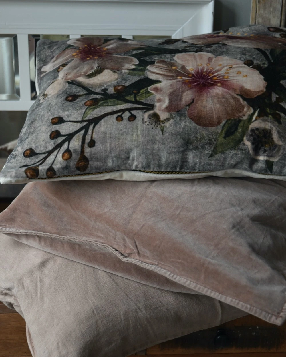 Velours kussen met pastel kleurige bloemen rechthoekig. Dit prachtige kussen in een rijke velours stop heeft een bloemenprint met pastel kleurige bloemen erop. Het model is rechthoekig, de kussenhoes kan met een rits open worden gemaakt, dit kussen is inclusief binnenkussen en de achterzijde van het kussen is effen cream velours. De mooie bloemenprint kan op heel veel manieren worden gecombineerd met bijvoorbeeld de mooie Tuscany kleuren voor een mooie pastel roze of liever nog minder kleur de burned roze kussenhoezen van IB Laursen.Â