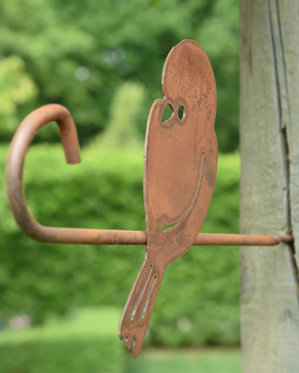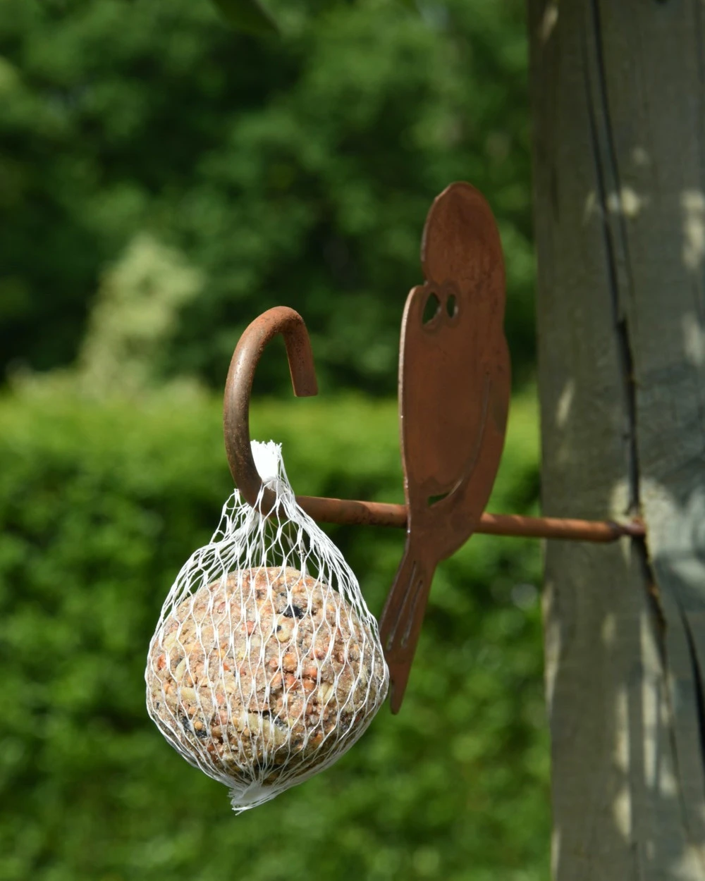 Vogel voederhaak van metaal met Musje. Dit leuke Musje zit op een (voeder) haak en is van metaal die door een speciale behandeling een mooie roestlaag heeft gekregen/. U kunt aan de krul van de haak/pin eventueel een vetbol hangen om de vogeltjes meet te voeren. Aan het uiteinde van de pin/haak zit een schroef die u in een boompaal, schutting of houten schuurtje kunt draaien (voorboren is fijn).