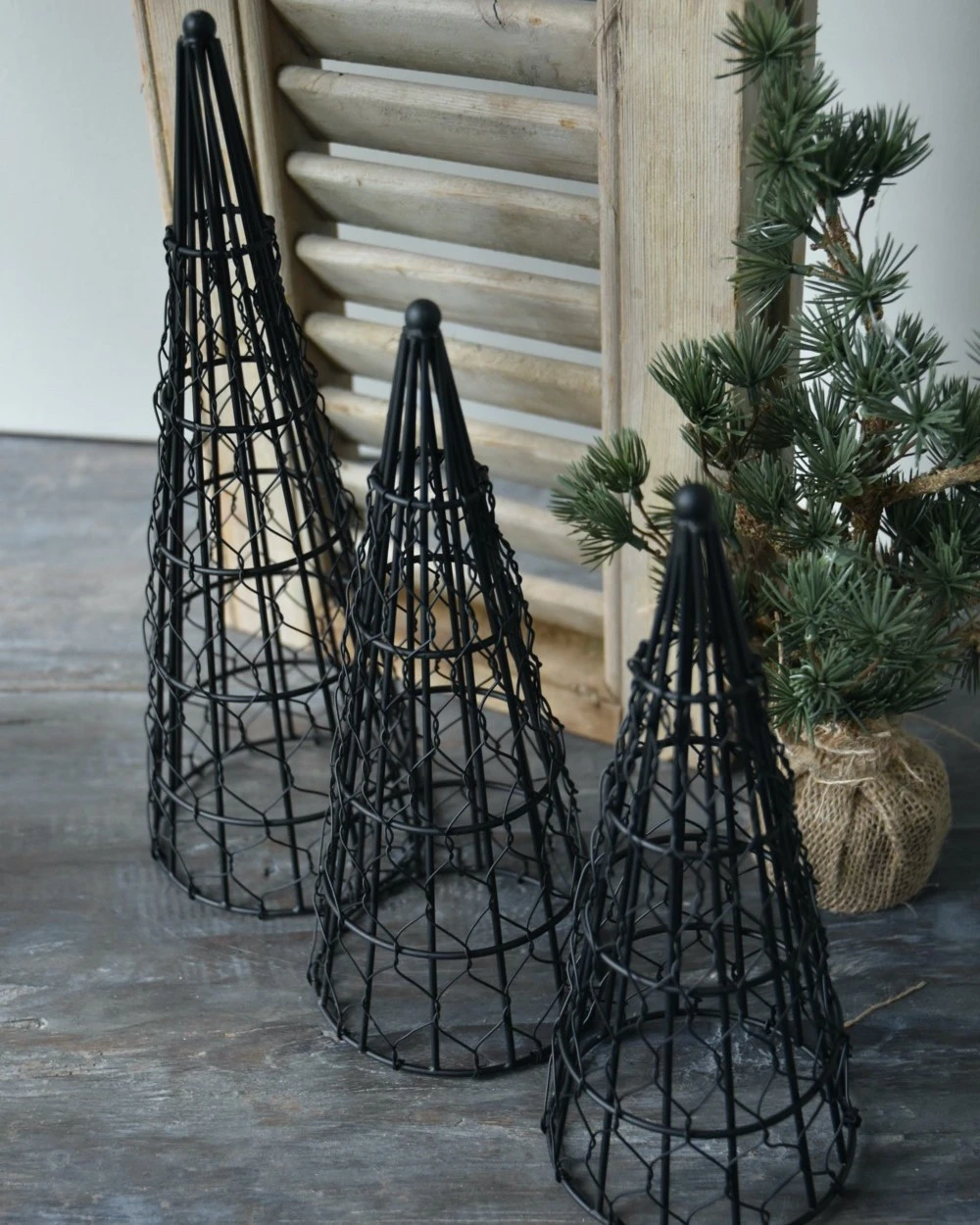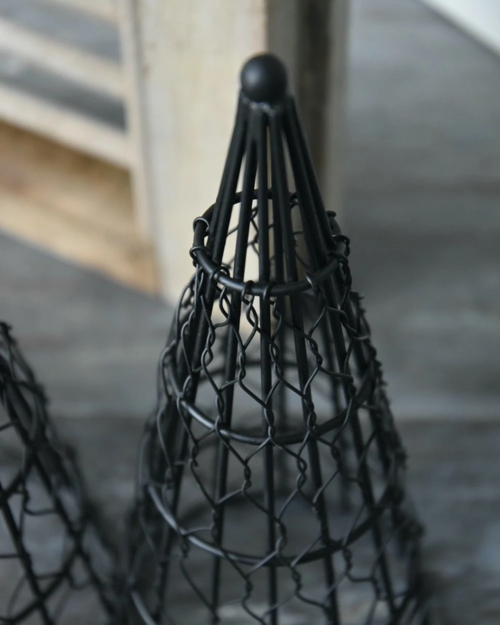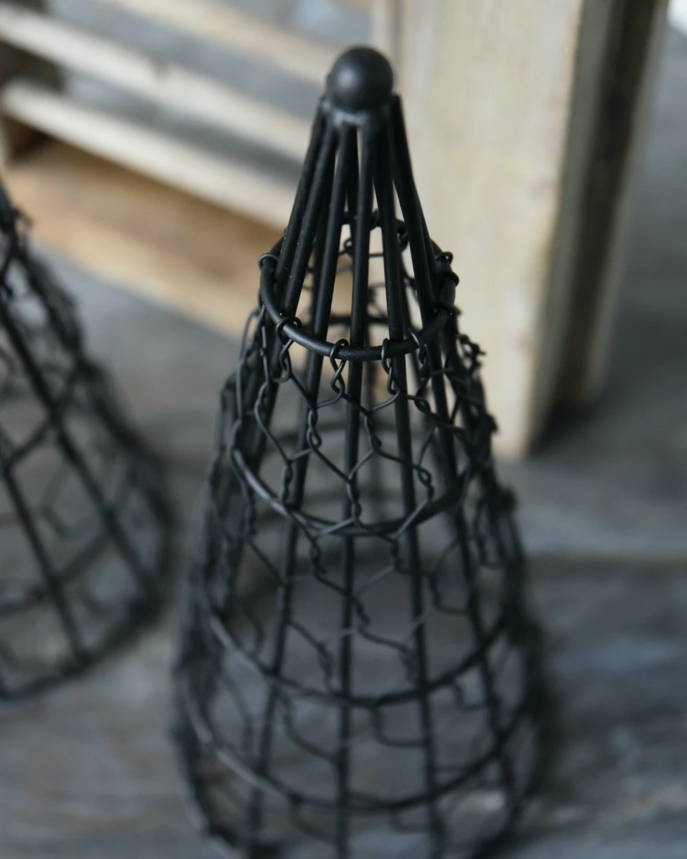 Zwarte punt draad manden set van 3 maten, Brynxz. Deze leuke set van metalen punt manden/bomen met gaas in het zwart zijn in 3 verschillende maten. U kunt het set zo neerzetten en er bv wat lichtjes of dennenappels in doen om zo een eigen sfeer te creëren. De punt manden zijn van het merk Brynxz en kunnen gemakkelijk worden neergezet en zo een gezellige hoekje maken. Het is ook leuk om ze plat neer te leggen of er bv een touw aan te zetten en ze op te hangen.