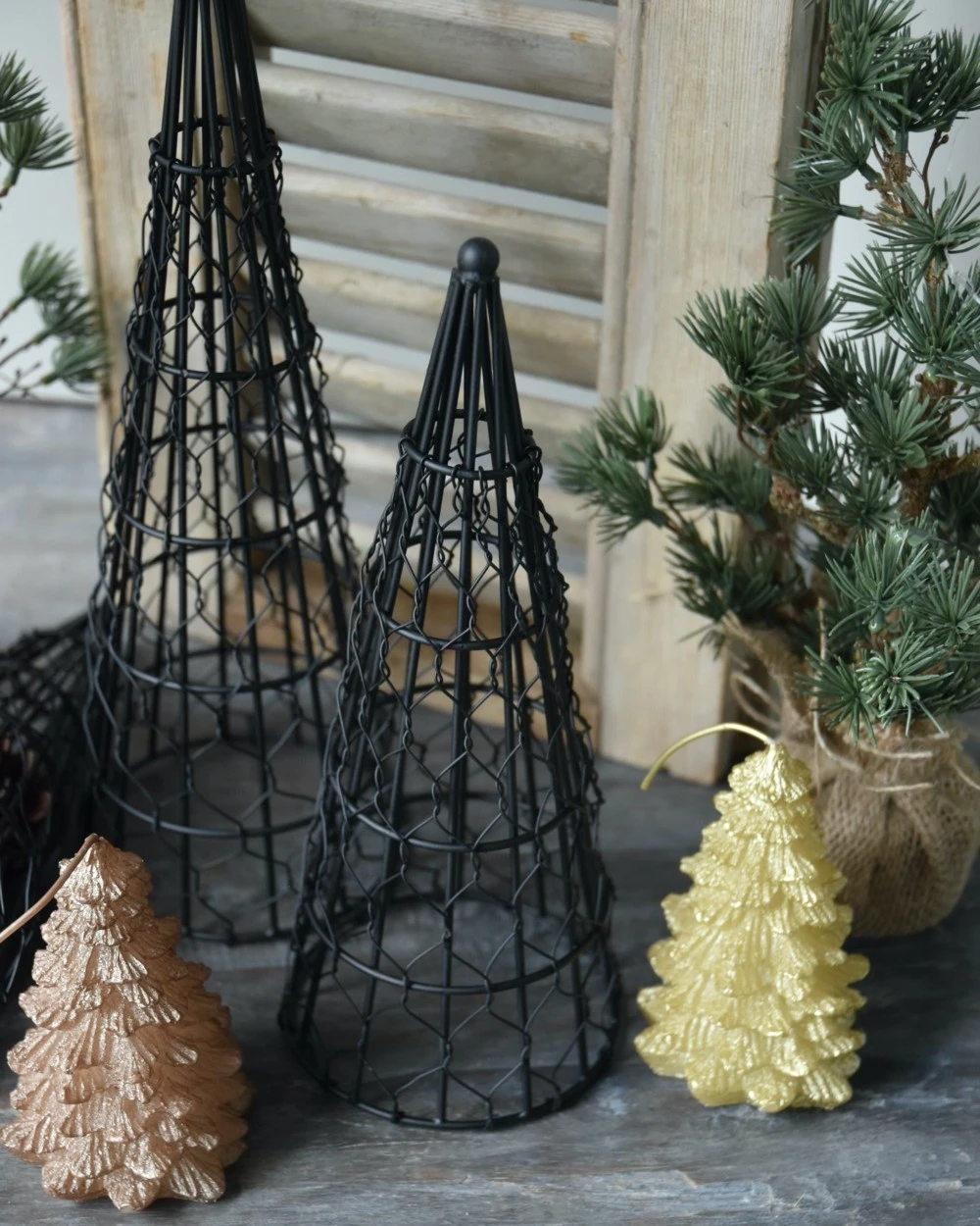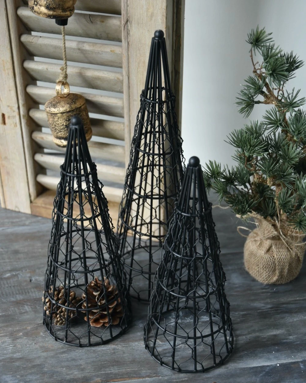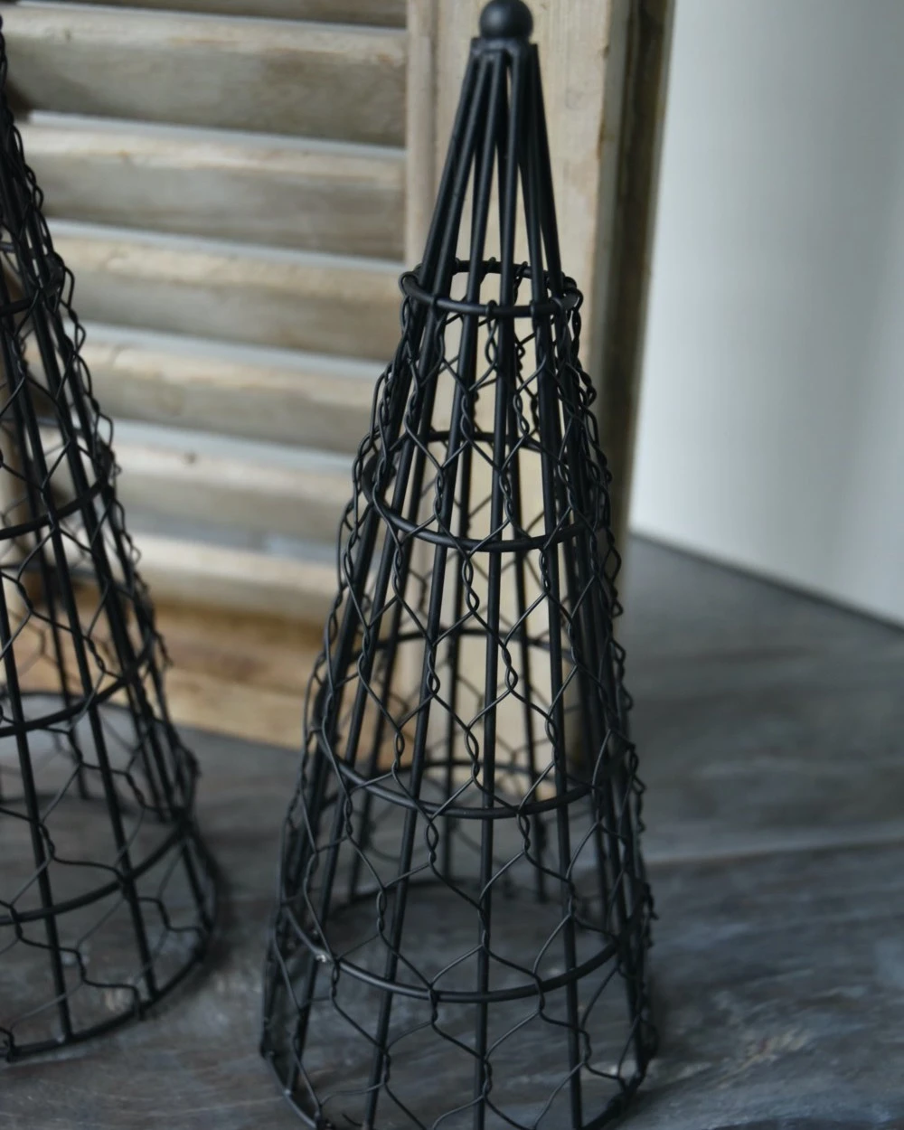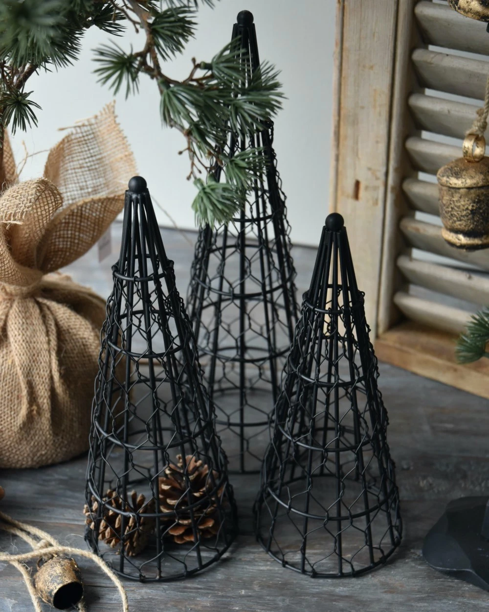 Zwarte punt draad manden set van 3 maten, Brynxz. Deze leuke set van metalen punt manden/bomen met gaas in het zwart zijn in 3 verschillende maten. U kunt het set zo neerzetten en er bv wat lichtjes of dennenappels in doen om zo een eigen sfeer te creëren. De punt manden zijn van het merk Brynxz en kunnen gemakkelijk worden neergezet en zo een gezellige hoekje maken. Het is ook leuk om ze plat neer te leggen of er bv een touw aan te zetten en ze op te hangen.